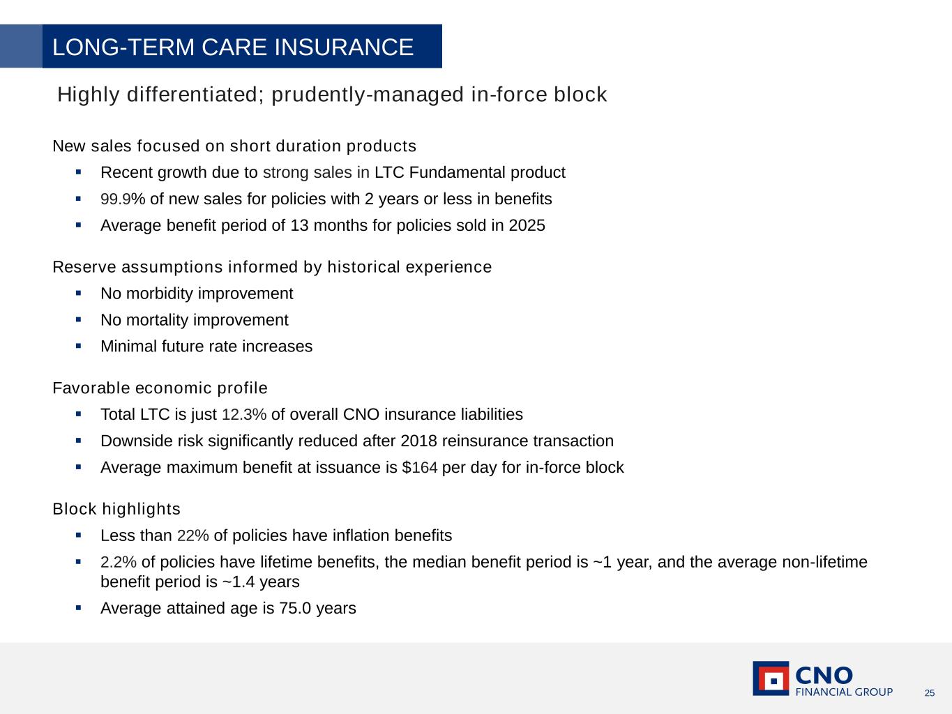 25 New sales focused on short duration products ▪ Recent growth due to strong sales in LTC Fundamental product ▪ 99.9% of new sales for policies with 2 years or less in benefits ▪ Average benefit period of 13 months for policies sold in 2025 Reserve assumptions informed by historical experience ▪ No morbidity improvement ▪ No mortality improvement ▪ Minimal future rate increases Favorable economic profile ▪ Total LTC is just 12.3% of overall CNO insurance liabilities ▪ Downside risk significantly reduced after 2018 reinsurance transaction ▪ Average maximum benefit at issuance is $164 per day for in-force block Block highlights ▪ Less than 22% of policies have inflation benefits ▪ 2.2% of policies have lifetime benefits, the median benefit period is ~1 year, and the average non-lifetime benefit period is ~1.4 years ▪ Average attained age is 75.0 years Highly differentiated; prudently-managed in-force block LONG-TERM CARE INSURANCE