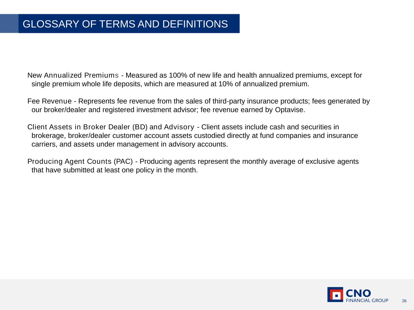26 GLOSSARY OF TERMS AND DEFINITIONS New Annualized Premiums - Measured as 100% of new life and health annualized premiums, except for single premium whole life deposits, which are measured at 10% of annualized premium. Fee Revenue - Represents fee revenue from the sales of third-party insurance products; fees generated by our broker/dealer and registered investment advisor; fee revenue earned by Optavise. Client Assets in Broker Dealer (BD) and Advisory - Client assets include cash and securities in brokerage, broker/dealer customer account assets custodied directly at fund companies and insurance carriers, and assets under management in advisory accounts. Producing Agent Counts (PAC) - Producing agents represent the monthly average of exclusive agents that have submitted at least one policy in the month.