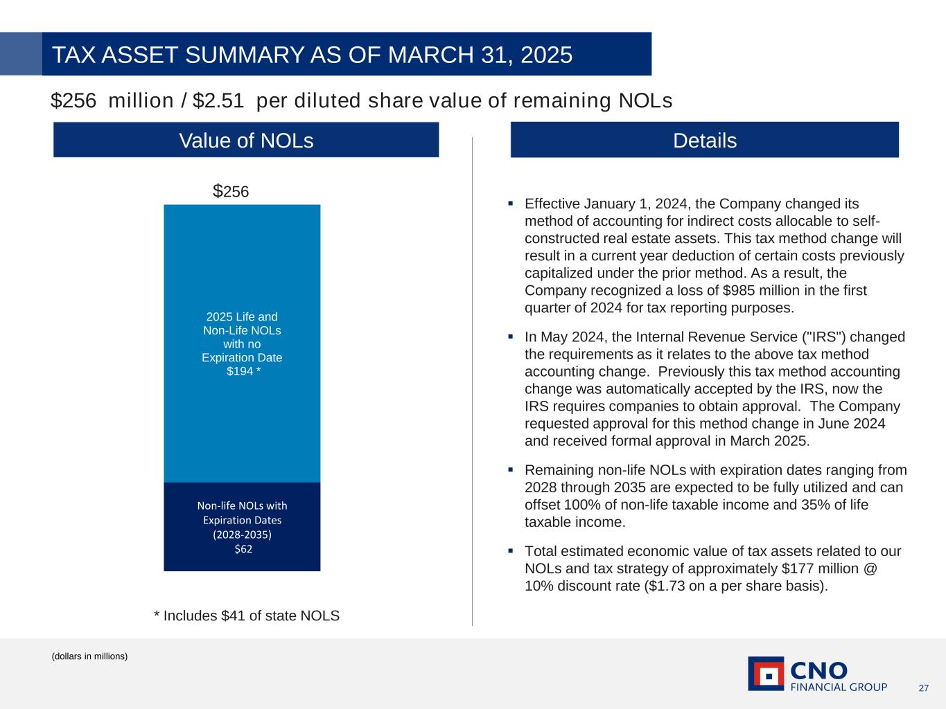 27 Value of NOLs Details ▪ Effective January 1, 2024, the Company changed its method of accounting for indirect costs allocable to self- constructed real estate assets. This tax method change will result in a current year deduction of certain costs previously capitalized under the prior method. As a result, the Company recognized a loss of $985 million in the first quarter of 2024 for tax reporting purposes. ▪ In May 2024, the Internal Revenue Service ("IRS") changed the requirements as it relates to the above tax method accounting change. Previously this tax method accounting change was automatically accepted by the IRS, now the IRS requires companies to obtain approval. The Company requested approval for this method change in June 2024 and received formal approval in March 2025. ▪ Remaining non-life NOLs with expiration dates ranging from 2028 through 2035 are expected to be fully utilized and can offset 100% of non-life taxable income and 35% of life taxable income. ▪ Total estimated economic value of tax assets related to our NOLs and tax strategy of approximately $177 million @ 10% discount rate ($1.73 on a per share basis). $256 (dollars in millions) $256 million / $2.51 per diluted share value of remaining NOLs TAX ASSET SUMMARY AS OF MARCH 31, 2025 Non-life NOLs with Expiration Dates (2028-2035) $62 2025 Life and Non-Life NOLs with no Expiration Date $194 * * Includes $41 of state NOLS