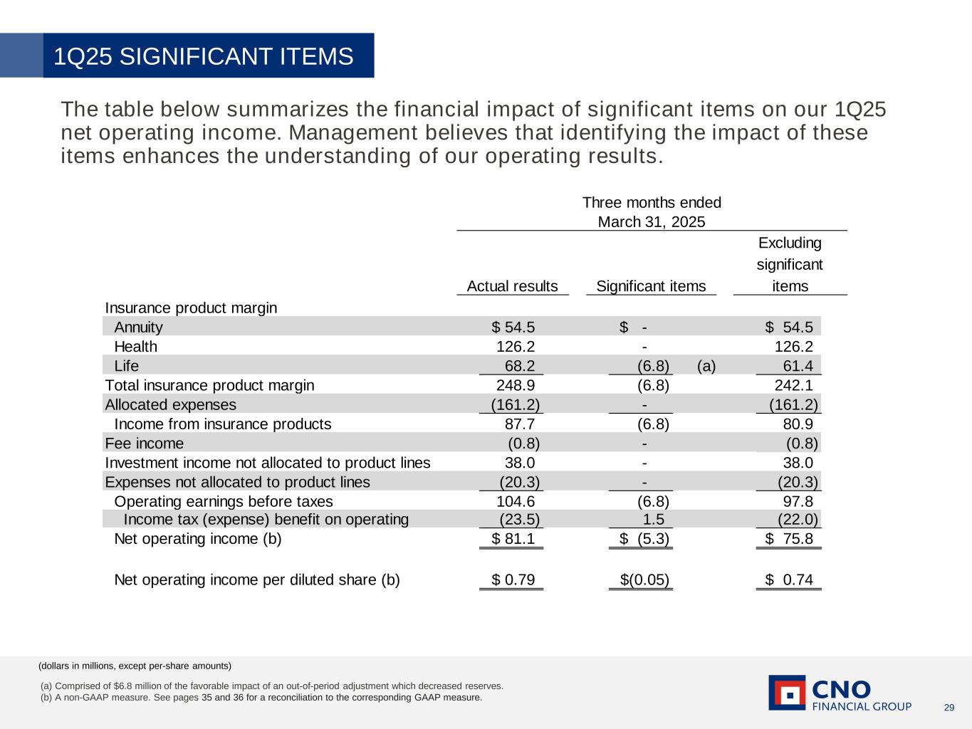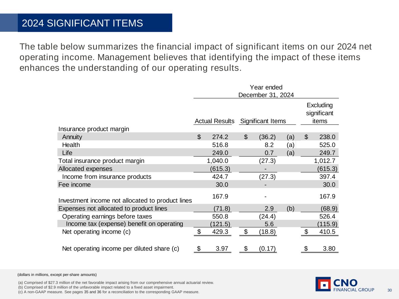 29 (dollars in millions, except per-share amounts) The table below summarizes the financial impact of significant items on our 1Q25 net operating income. Management believes that identifying the impact of these items enhances the understanding of our operating results. 1Q25 SIGNIFICANT ITEMS Insurance product margin Annuity 54.5$ -$ 54.5$ Health 126.2 - 126.2 Life 68.2 (6.8) (a) 61.4 Total insurance product margin 248.9 (6.8) 242.1 Allocated expenses (161.2) - (161.2) Income from insurance products 87.7 (6.8) 80.9 Fee income (0.8) - (0.8) Investment income not allocated to product lines 38.0 - 38.0 Expenses not allocated to product lines (20.3) - (20.3) Operating earnings before taxes 104.6 (6.8) 97.8 Income tax (expense) benefit on operating (23.5) 1.5 (22.0) Net operating income (b) 81.1$ (5.3)$ 75.8$ Net operating income per diluted share (b) 0.79$ (0.05)$ 0.74$ Three months ended March 31, 2025 Actual results Significant items Excluding significant items (a) Comprised of $6.8 million of the favorable impact of an out-of-period adjustment which decreased reserves. (b) A non-GAAP measure. See pages 35 and 36 for a reconciliation to the corresponding GAAP measure.