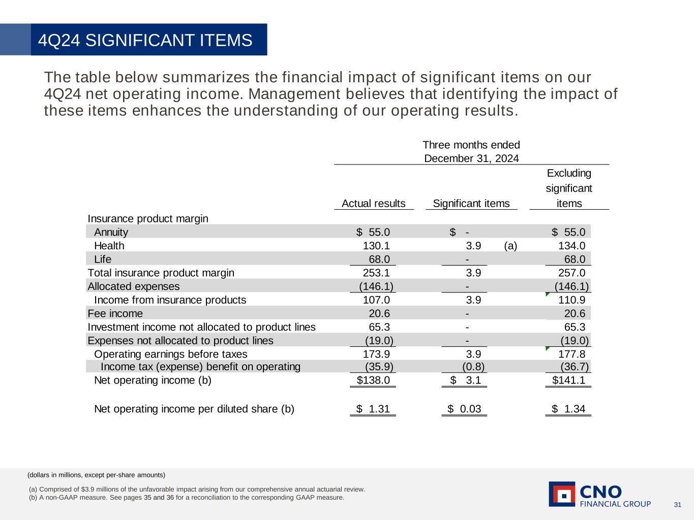 30 2024 SIGNIFICANT ITEMS The table below summarizes the financial impact of significant items on our 2024 net operating income. Management believes that identifying the impact of these items enhances the understanding of our operating results. (dollars in millions, except per-share amounts) (a) Comprised of $27.3 million of the net favorable impact arising from our comprehensive annual actuarial review. (b) Comprised of $2.9 million of the unfavorable impact related to a fixed asset impairment. (c) A non-GAAP measure. See pages 35 and 36 for a reconciliation to the corresponding GAAP measure. Actual Results Significant Items Excluding significant items Insurance product margin Annuity 274.2$ (36.2)$ (a) 238.0$ Health 516.8 8.2 (a) 525.0 Life 249.0 0.7 (a) 249.7 Total insurance product margin 1,040.0 (27.3) 1,012.7 Allocated expenses (615.3) - (615.3) Income from insurance products 424.7 (27.3) 397.4 Fee income 30.0 - 30.0 Investment income not allocated to product lines 167.9 - 167.9 Expenses not allocated to product lines (71.8) 2.9 (b) (68.9) Operating earnings before taxes 550.8 (24.4) 526.4 Income tax (expense) benefit on operating (121.5) 5.6 (115.9) Net operating income (c) 429.3$ (18.8)$ 410.5$ Net operating income per diluted share (c) 3.97$ (0.17)$ 3.80$ December 31, 2024 Year ended
