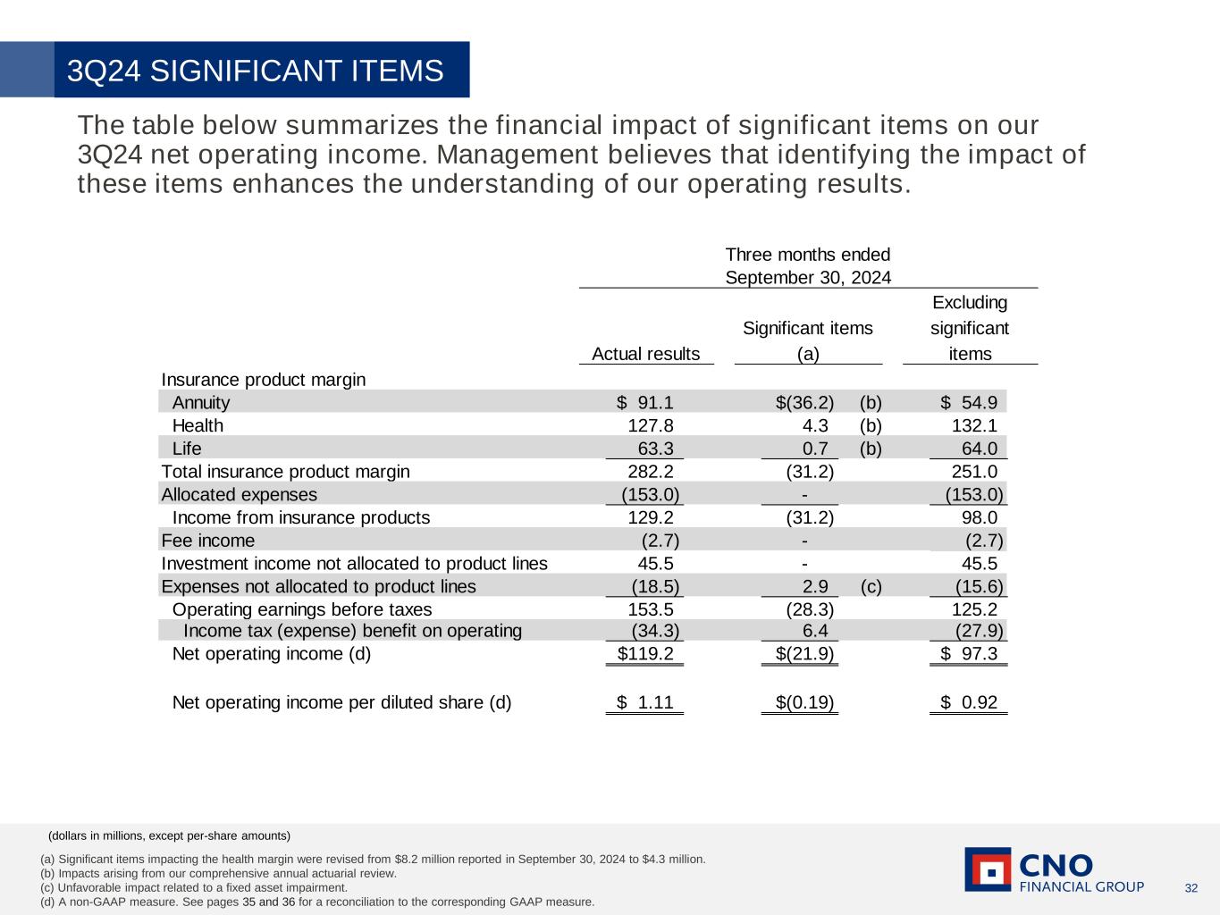 31 (dollars in millions, except per-share amounts) The table below summarizes the financial impact of significant items on our 4Q24 net operating income. Management believes that identifying the impact of these items enhances the understanding of our operating results. 4Q24 SIGNIFICANT ITEMS Insurance product margin Annuity 55.0$ -$ 55.0$ Health 130.1 3.9 (a) 134.0 Life 68.0 - 68.0 Total insurance product margin 253.1 3.9 257.0 Allocated expenses (146.1) - (146.1) Income from insurance products 107.0 3.9 110.9 Fee income 20.6 - 20.6 Investment income not allocated to product lines 65.3 - 65.3 Expenses not allocated to product lines (19.0) - (19.0) Operating earnings before taxes 173.9 3.9 177.8 Income tax (expense) benefit on operating (35.9) (0.8) (36.7) Net operating income (b) 138.0$ 3.1$ 141.1$ Net operating income per diluted share (b) 1.31$ 0.03$ 1.34$ Three months ended December 31, 2024 Actual results Significant items Excluding significant items (a) Comprised of $3.9 millions of the unfavorable impact arising from our comprehensive annual actuarial review. (b) A non-GAAP measure. See pages 35 and 36 for a reconciliation to the corresponding GAAP measure.