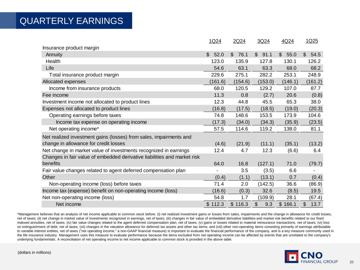 32 (dollars in millions, except per-share amounts) (a) Significant items impacting the health margin were revised from $8.2 million reported in September 30, 2024 to $4.3 million. (b) Impacts arising from our comprehensive annual actuarial review. (c) Unfavorable impact related to a fixed asset impairment. (d) A non-GAAP measure. See pages 35 and 36 for a reconciliation to the corresponding GAAP measure. The table below summarizes the financial impact of significant items on our 3Q24 net operating income. Management believes that identifying the impact of these items enhances the understanding of our operating results. 3Q24 SIGNIFICANT ITEMS Insurance product margin Annuity 91.1$ (36.2)$ (b) 54.9$ Health 127.8 4.3 (b) 132.1 Life 63.3 0.7 (b) 64.0 Total insurance product margin 282.2 (31.2) 251.0 Allocated expenses (153.0) - (153.0) Income from insurance products 129.2 (31.2) 98.0 Fee income (2.7) - (2.7) Investment income not allocated to product lines 45.5 - 45.5 Expenses not allocated to product lines (18.5) 2.9 (c) (15.6) Operating earnings before taxes 153.5 (28.3) 125.2 Income tax (expense) benefit on operating (34.3) 6.4 (27.9) Net operating income (d) 119.2$ (21.9)$ 97.3$ Net operating income per diluted share (d) 1.11$ (0.19)$ 0.92$ Three months ended September 30, 2024 Actual results Significant items (a) Excluding significant items