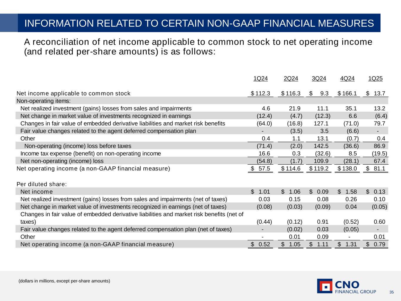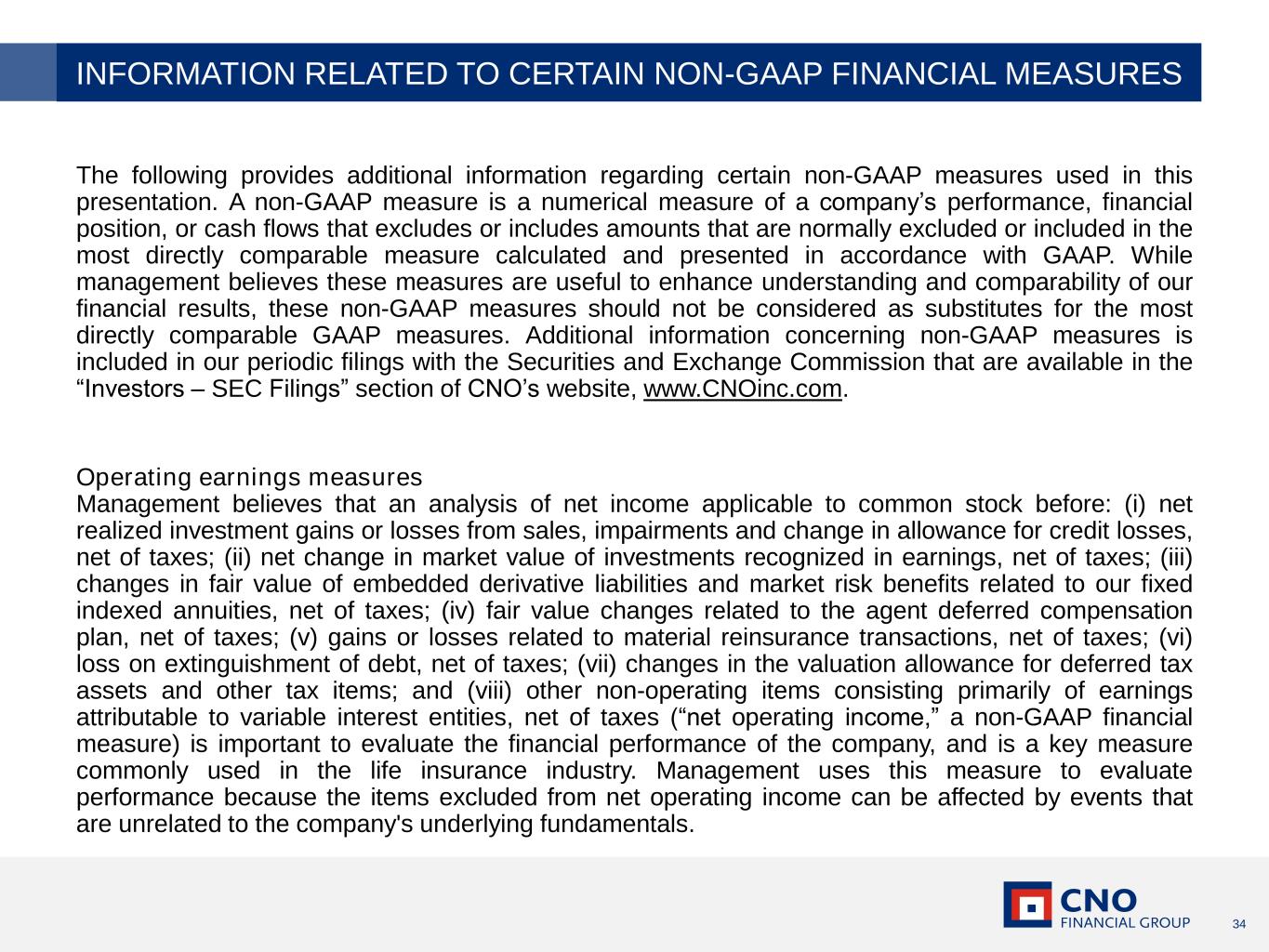 34 The following provides additional information regarding certain non-GAAP measures used in this presentation. A non-GAAP measure is a numerical measure of a company’s performance, financial position, or cash flows that excludes or includes amounts that are normally excluded or included in the most directly comparable measure calculated and presented in accordance with GAAP. While management believes these measures are useful to enhance understanding and comparability of our financial results, these non-GAAP measures should not be considered as substitutes for the most directly comparable GAAP measures. Additional information concerning non-GAAP measures is included in our periodic filings with the Securities and Exchange Commission that are available in the “Investors – SEC Filings” section of CNO’s website, www.CNOinc.com. Operating earnings measures Management believes that an analysis of net income applicable to common stock before: (i) net realized investment gains or losses from sales, impairments and change in allowance for credit losses, net of taxes; (ii) net change in market value of investments recognized in earnings, net of taxes; (iii) changes in fair value of embedded derivative liabilities and market risk benefits related to our fixed indexed annuities, net of taxes; (iv) fair value changes related to the agent deferred compensation plan, net of taxes; (v) gains or losses related to material reinsurance transactions, net of taxes; (vi) loss on extinguishment of debt, net of taxes; (vii) changes in the valuation allowance for deferred tax assets and other tax items; and (viii) other non-operating items consisting primarily of earnings attributable to variable interest entities, net of taxes (“net operating income,” a non-GAAP financial measure) is important to evaluate the financial performance of the company, and is a key measure commonly used in the life insurance industry. Management uses this measure to evaluate performance because the items excluded from net operating income can be affected by events that are unrelated to the company's underlying fundamentals. INFORMATION RELATED TO CERTAIN NON-GAAP FINANCIAL MEASURES