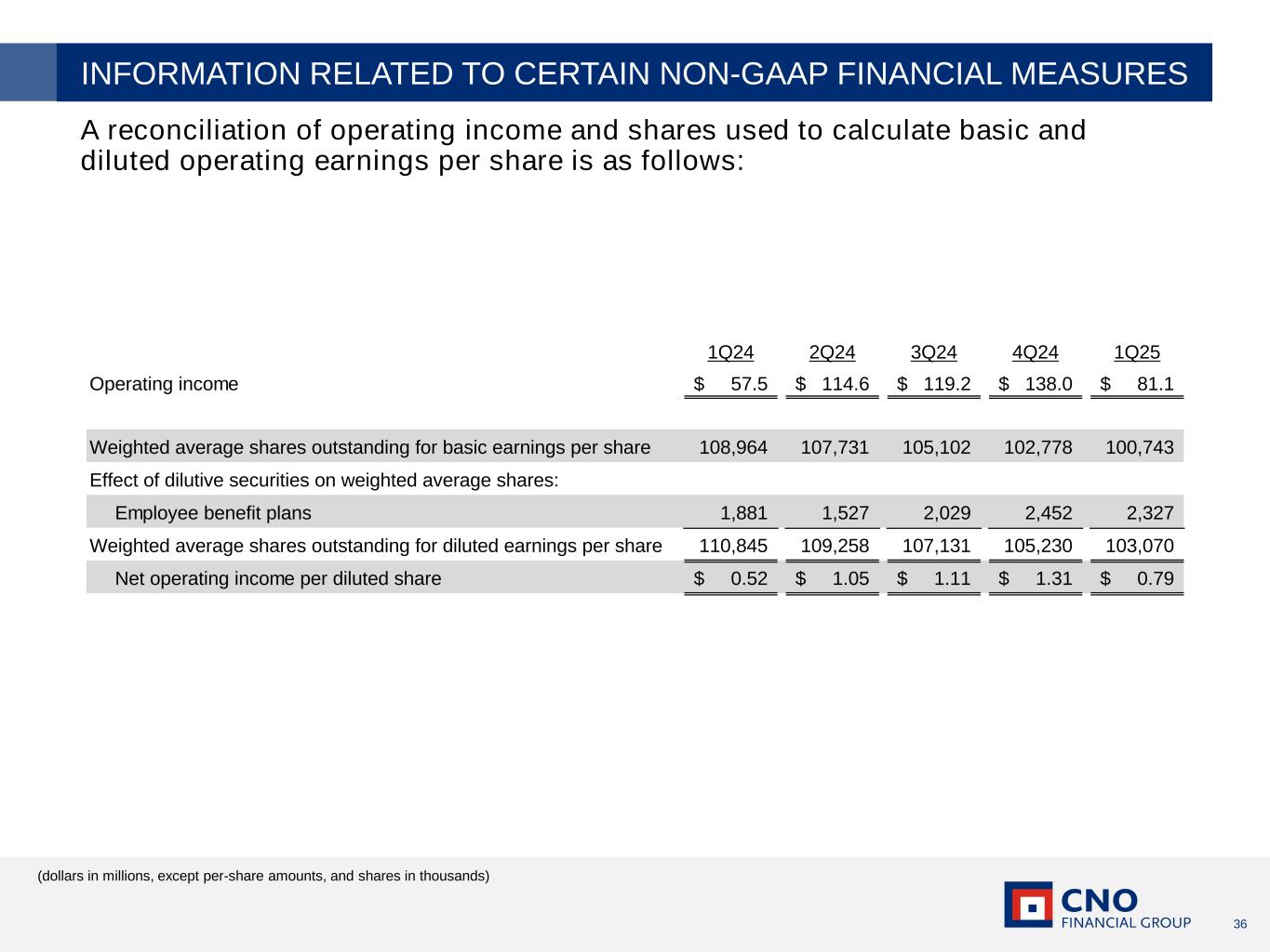 35 A reconciliation of net income applicable to common stock to net operating income (and related per-share amounts) is as follows: (dollars in millions, except per-share amounts) INFORMATION RELATED TO CERTAIN NON-GAAP FINANCIAL MEASURES 1Q24 2Q24 3Q24 4Q24 1Q25 Net income applicable to common stock 112.3$ 116.3$ 9.3$ 166.1$ 13.7$ Non-operating items: Net realized investment (gains) losses from sales and impairments 4.6 21.9 11.1 35.1 13.2 Net change in market value of investments recognized in earnings (12.4) (4.7) (12.3) 6.6 (6.4) Changes in fair value of embedded derivative liabilities and market risk benefits (64.0) (16.8) 127.1 (71.0) 79.7 Fair value changes related to the agent deferred compensation plan - (3.5) 3.5 (6.6) - Other 0.4 1.1 13.1 (0.7) 0.4 Non-operating (income) loss before taxes (71.4) (2.0) 142.5 (36.6) 86.9 Income tax expense (benefit) on non-operating income 16.6 0.3 (32.6) 8.5 (19.5) Net non-operating (income) loss (54.8) (1.7) 109.9 (28.1) 67.4 Net operating income (a non-GAAP financial measure) 57.5$ 114.6$ 119.2$ 138.0$ 81.1$ Per diluted share: Net income 1.01$ 1.06$ 0.09$ 1.58$ 0.13$ Net realized investment (gains) losses from sales and impairments (net of taxes) 0.03 0.15 0.08 0.26 0.10 Net change in market value of investments recognized in earnings (net of taxes) (0.08) (0.03) (0.09) 0.04 (0.05) Changes in fair value of embedded derivative liabilities and market risk benefits (net of taxes) (0.44) (0.12) 0.91 (0.52) 0.60 Fair value changes related to the agent deferred compensation plan (net of taxes) - (0.02) 0.03 (0.05) - Other - 0.01 0.09 - 0.01 Net operating income (a non-GAAP financial measure) 0.52$ 1.05$ 1.11$ 1.31$ 0.79$