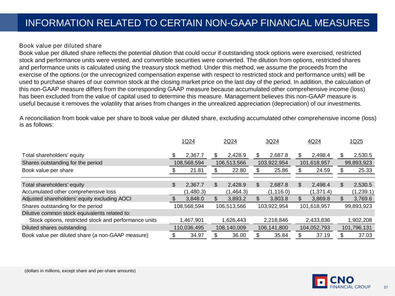 37 Book value per diluted share Book value per diluted share reflects the potential dilution that could occur if outstanding stock options were exercised, restricted stock and performance units were vested, and convertible securities were converted. The dilution from options, restricted shares and performance units is calculated using the treasury stock method. Under this method, we assume the proceeds from the exercise of the options (or the unrecognized compensation expense with respect to restricted stock and performance units) will be used to purchase shares of our common stock at the closing market price on the last day of the period. In addition, the calculation of this non-GAAP measure differs from the corresponding GAAP measure because accumulated other comprehensive income (loss) has been excluded from the value of capital used to determine this measure. Management believes this non-GAAP measure is useful because it removes the volatility that arises from changes in the unrealized appreciation (depreciation) of our investments. A reconciliation from book value per share to book value per diluted share, excluding accumulated other comprehensive income (loss) is as follows: (dollars in millions, except share and per-share amounts) INFORMATION RELATED TO CERTAIN NON-GAAP FINANCIAL MEASURES 1Q24 2Q24 3Q24 4Q24 1Q25 Total shareholders' equity 2,367.7$ 2,428.9$ 2,687.8$ 2,498.4$ 2,530.5$ Shares outstanding for the period 108,568,594 106,513,566 103,922,954 101,618,957 99,893,923 Book value per share 21.81$ 22.80$ 25.86$ 24.59$ 25.33$ Total shareholders' equity 2,367.7$ 2,428.9$ 2,687.8$ 2,498.4$ 2,530.5$ Accumulated other comprehensive loss (1,480.3) (1,464.3) (1,116.0) (1,371.4) (1,239.1) Adjusted shareholders' equity excluding AOCI 3,848.0$ 3,893.2$ 3,803.8$ 3,869.8$ 3,769.6$ Shares outstanding for the period 108,568,594 106,513,566 103,922,954 101,618,957 99,893,923 Dilutive common stock equivalents related to: Stock options, restricted stock and performance units 1,467,901 1,626,443 2,218,846 2,433,836 1,902,208 Diluted shares outstanding 110,036,495 108,140,009 106,141,800 104,052,793 101,796,131 Book value per diluted share (a non-GAAP measure) 34.97$ 36.00$ 35.84$ 37.19$ 37.03$