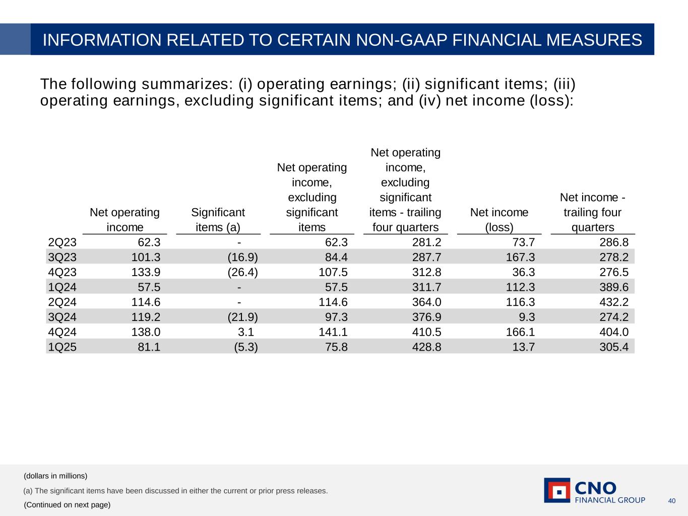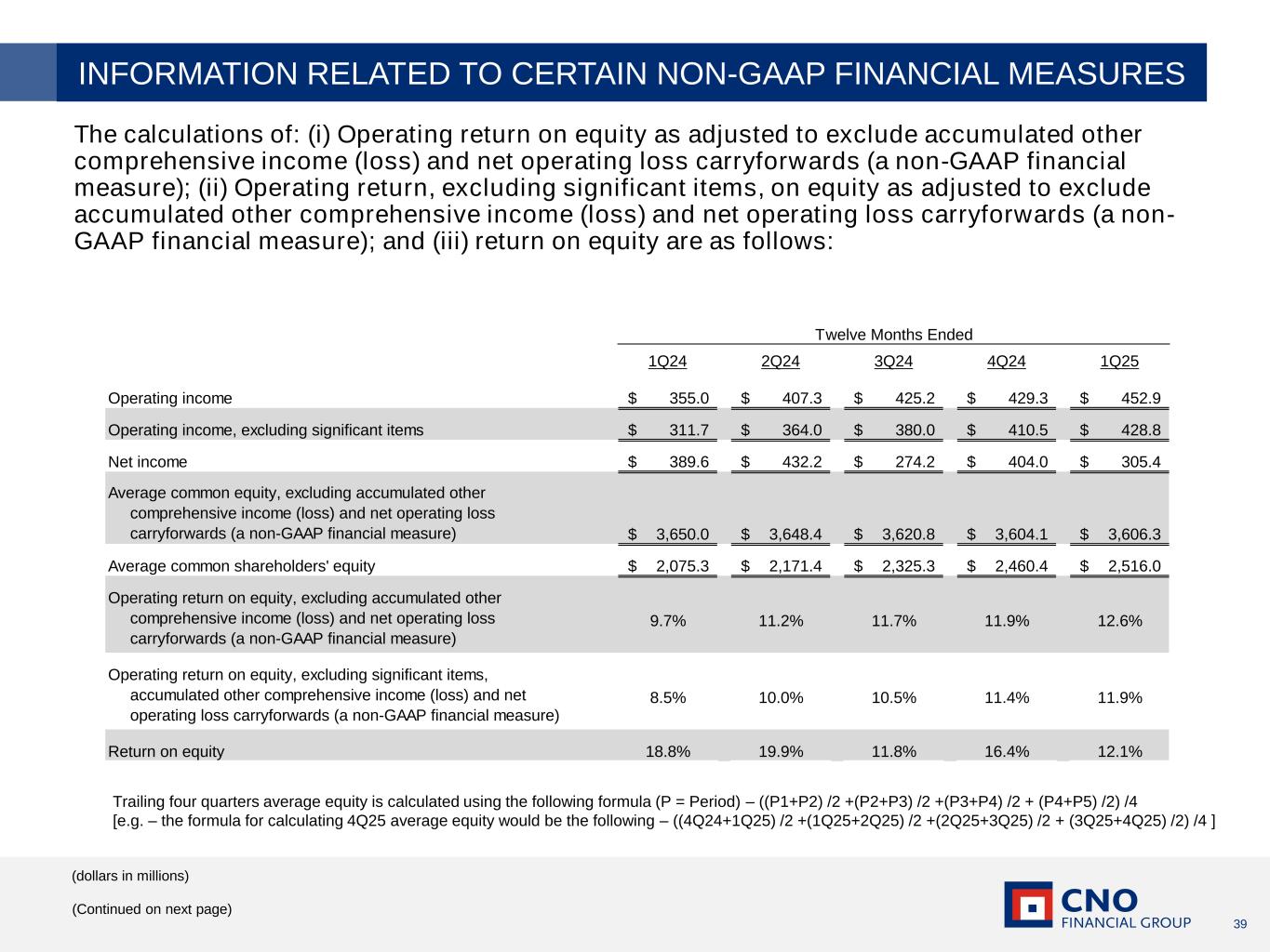 39 The calculations of: (i) Operating return on equity as adjusted to exclude accumulated other comprehensive income (loss) and net operating loss carryforwards (a non-GAAP financial measure); (ii) Operating return, excluding significant items, on equity as adjusted to exclude accumulated other comprehensive income (loss) and net operating loss carryforwards (a non- GAAP financial measure); and (iii) return on equity are as follows: (dollars in millions) (Continued on next page) INFORMATION RELATED TO CERTAIN NON-GAAP FINANCIAL MEASURES 1Q24 2Q24 3Q24 4Q24 1Q25 Operating income 355.0$ 407.3$ 425.2$ 429.3$ 452.9$ Operating income, excluding significant items 311.7$ 364.0$ 380.0$ 410.5$ 428.8$ Net income 389.6$ 432.2$ 274.2$ 404.0$ 305.4$ Average common equity, excluding accumulated other comprehensive income (loss) and net operating loss carryforwards (a non-GAAP financial measure) 3,650.0$ 3,648.4$ 3,620.8$ 3,604.1$ 3,606.3$ Average common shareholders' equity 2,075.3$ 2,171.4$ 2,325.3$ 2,460.4$ 2,516.0$ Operating return on equity, excluding accumulated other comprehensive income (loss) and net operating loss carryforwards (a non-GAAP financial measure) 9.7% 11.2% 11.7% 11.9% 12.6% Operating return on equity, excluding significant items, accumulated other comprehensive income (loss) and net operating loss carryforwards (a non-GAAP financial measure) 8.5% 10.0% 10.5% 11.4% 11.9% Return on equity 18.8% 19.9% 11.8% 16.4% 12.1% Twelve Months Ended Trailing four quarters average equity is calculated using the following formula (P = Period) – ((P1+P2) /2 +(P2+P3) /2 +(P3+P4) /2 + (P4+P5) /2) /4 [e.g. – the formula for calculating 4Q25 average equity would be the following – ((4Q24+1Q25) /2 +(1Q25+2Q25) /2 +(2Q25+3Q25) /2 + (3Q25+4Q25) /2) /4 ]