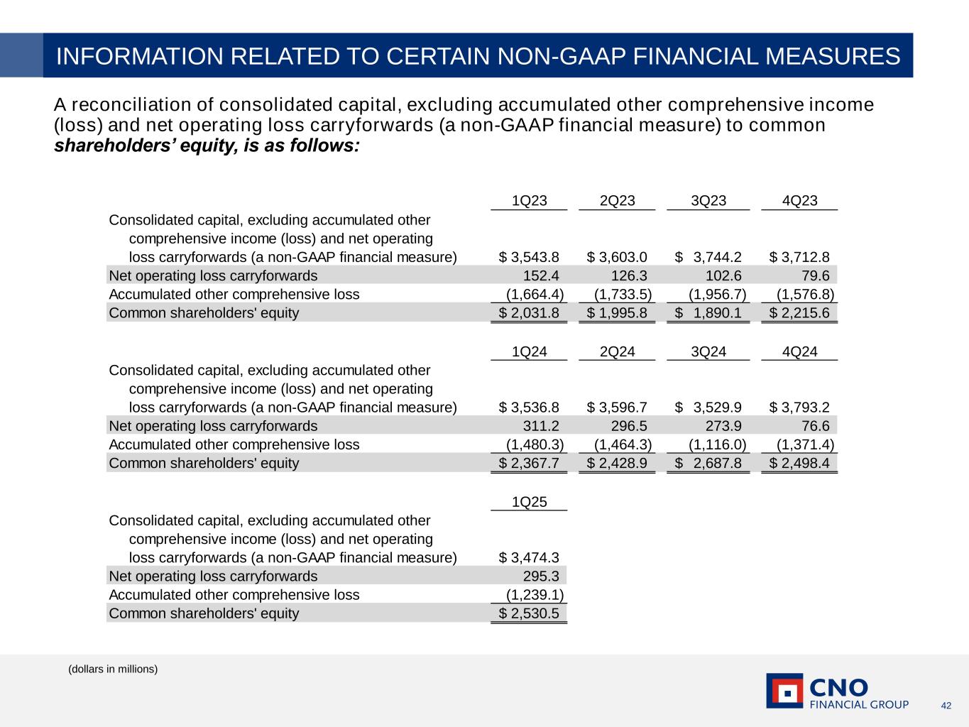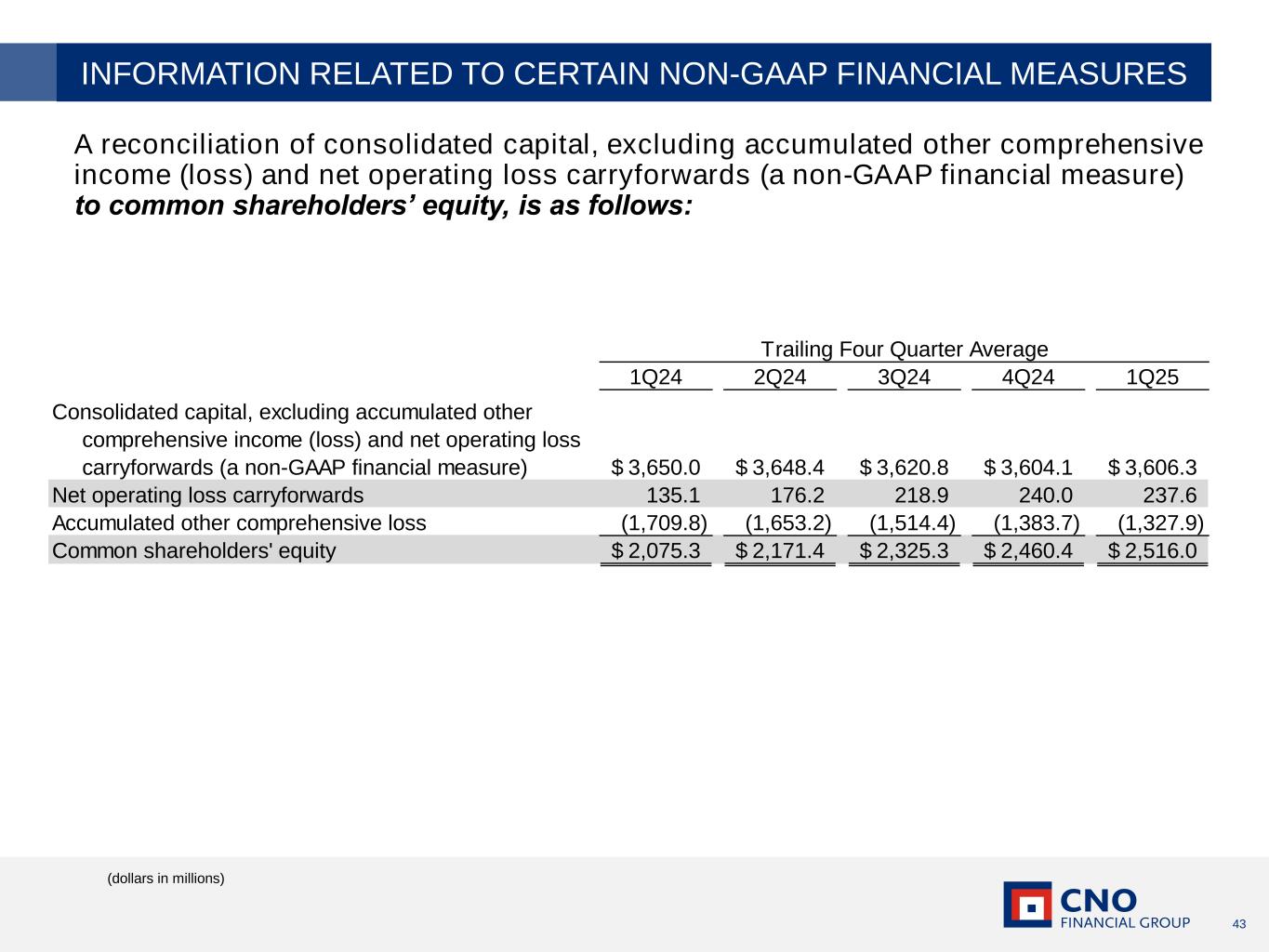 42 A reconciliation of consolidated capital, excluding accumulated other comprehensive income (loss) and net operating loss carryforwards (a non-GAAP financial measure) to common shareholders’ equity, is as follows: (dollars in millions) INFORMATION RELATED TO CERTAIN NON-GAAP FINANCIAL MEASURES 1Q23 2Q23 3Q23 4Q23 Consolidated capital, excluding accumulated other comprehensive income (loss) and net operating loss carryforwards (a non-GAAP financial measure) 3,543.8$ 3,603.0$ 3,744.2$ 3,712.8$ Net operating loss carryforwards 152.4 126.3 102.6 79.6 Accumulated other comprehensive loss (1,664.4) (1,733.5) (1,956.7) (1,576.8) Common shareholders' equity 2,031.8$ 1,995.8$ 1,890.1$ 2,215.6$ 1Q24 2Q24 3Q24 4Q24 Consolidated capital, excluding accumulated other comprehensive income (loss) and net operating loss carryforwards (a non-GAAP financial measure) 3,536.8$ 3,596.7$ 3,529.9$ 3,793.2$ Net operating loss carryforwards 311.2 296.5 273.9 76.6 Accumulated other comprehensive loss (1,480.3) (1,464.3) (1,116.0) (1,371.4) Common shareholders' equity 2,367.7$ 2,428.9$ 2,687.8$ 2,498.4$ 1Q25 Consolidated capital, excluding accumulated other comprehensive income (loss) and net operating loss carryforwards (a non-GAAP financial measure) 3,474.3$ Net operating loss carryforwards 295.3 Accumulated other comprehensive loss (1,239.1) Common shareholders' equity 2,530.5$