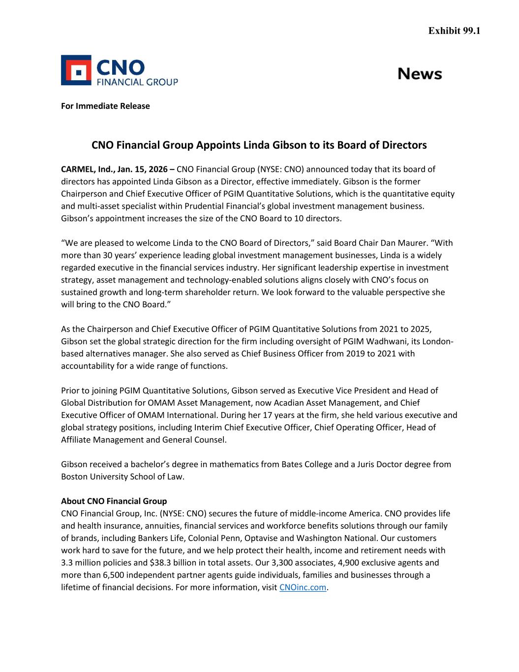 Exhibit 99.1 For Immediate Release CNO Financial Group Appoints Linda Gibson to its Board of Directors CARMEL, Ind., Jan. 15, 2026 – CNO Financial Group (NYSE: CNO) announced today that its board of directors has appointed Linda Gibson as a Director, effective immediately. Gibson is the former Chairperson and Chief Executive Officer of PGIM Quantitative Solutions, which is the quantitative equity and multi-asset specialist within Prudential Financial’s global investment management business. Gibson’s appointment increases the size of the CNO Board to 10 directors. “We are pleased to welcome Linda to the CNO Board of Directors,” said Board Chair Dan Maurer. “With more than 30 years’ experience leading global investment management businesses, Linda is a widely regarded executive in the financial services industry. Her significant leadership expertise in investment strategy, asset management and technology-enabled solutions aligns closely with CNO’s focus on sustained growth and long-term shareholder return. We look forward to the valuable perspective she will bring to the CNO Board.” As the Chairperson and Chief Executive Officer of PGIM Quantitative Solutions from 2021 to 2025, Gibson set the global strategic direction for the firm including oversight of PGIM Wadhwani, its London- based alternatives manager. She also served as Chief Business Officer from 2019 to 2021 with accountability for a wide range of functions. Prior to joining PGIM Quantitative Solutions, Gibson served as Executive Vice President and Head of Global Distribution for OMAM Asset Management, now Acadian Asset Management, and Chief Executive Officer of OMAM International. During her 17 years at the firm, she held various executive and global strategy positions, including Interim Chief Executive Officer, Chief Operating Officer, Head of Affiliate Management and General Counsel. Gibson received a bachelor’s degree in mathematics from Bates College and a Juris Doctor degree from Boston University School of Law. About CNO Financial Group CNO Financial Group, Inc. (NYSE: CNO) secures the future of middle-income America. CNO provides life and health insurance, annuities, financial services and workforce benefits solutions through our family of brands, including Bankers Life, Colonial Penn, Optavise and Washington National. Our customers work hard to save for the future, and we help protect their health, income and retirement needs with 3.3 million policies and $38.3 billion in total assets. Our 3,300 associates, 4,900 exclusive agents and more than 6,500 independent partner agents guide individuals, families and businesses through a lifetime of financial decisions. For more information, visit CNOinc.com.