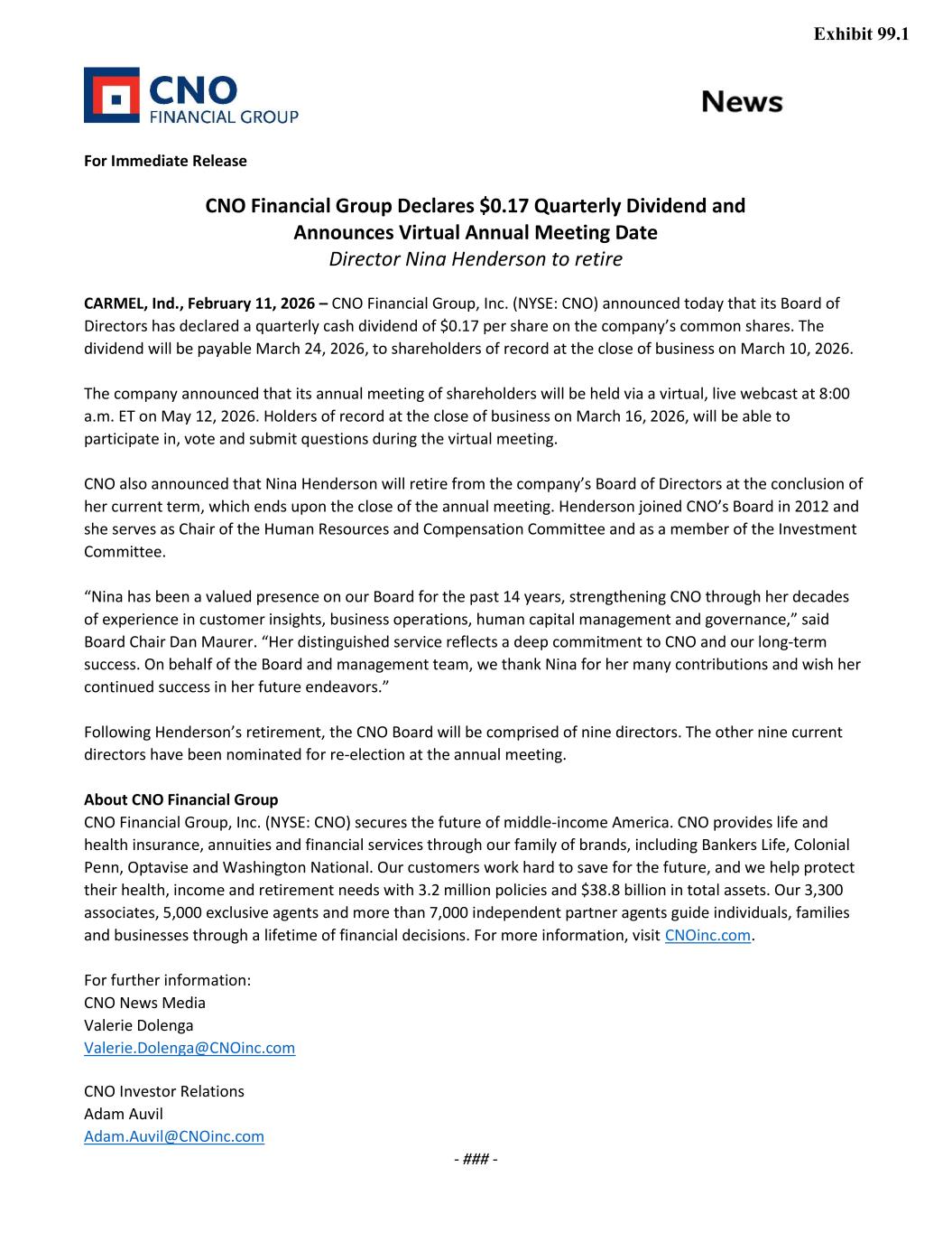 Exhibit 99.1 For Immediate Release CNO Financial Group Declares $0.17 Quarterly Dividend and Announces Virtual Annual Meeting Date Director Nina Henderson to retire CARMEL, Ind., February 11, 2026 – CNO Financial Group, Inc. (NYSE: CNO) announced today that its Board of Directors has declared a quarterly cash dividend of $0.17 per share on the company’s common shares. The dividend will be payable March 24, 2026, to shareholders of record at the close of business on March 10, 2026. The company announced that its annual meeting of shareholders will be held via a virtual, live webcast at 8:00 a.m. ET on May 12, 2026. Holders of record at the close of business on March 16, 2026, will be able to participate in, vote and submit questions during the virtual meeting. CNO also announced that Nina Henderson will retire from the company’s Board of Directors at the conclusion of her current term, which ends upon the close of the annual meeting. Henderson joined CNO’s Board in 2012 and she serves as Chair of the Human Resources and Compensation Committee and as a member of the Investment Committee. “Nina has been a valued presence on our Board for the past 14 years, strengthening CNO through her decades of experience in customer insights, business operations, human capital management and governance,” said Board Chair Dan Maurer. “Her distinguished service reflects a deep commitment to CNO and our long-term success. On behalf of the Board and management team, we thank Nina for her many contributions and wish her continued success in her future endeavors.” Following Henderson’s retirement, the CNO Board will be comprised of nine directors. The other nine current directors have been nominated for re-election at the annual meeting. About CNO Financial Group CNO Financial Group, Inc. (NYSE: CNO) secures the future of middle-income America. CNO provides life and health insurance, annuities and financial services through our family of brands, including Bankers Life, Colonial Penn, Optavise and Washington National. Our customers work hard to save for the future, and we help protect their health, income and retirement needs with 3.2 million policies and $38.8 billion in total assets. Our 3,300 associates, 5,000 exclusive agents and more than 7,000 independent partner agents guide individuals, families and businesses through a lifetime of financial decisions. For more information, visit CNOinc.com. For further information: CNO News Media Valerie Dolenga Valerie.Dolenga@CNOinc.com CNO Investor Relations Adam Auvil Adam.Auvil@CNOinc.com - ### -