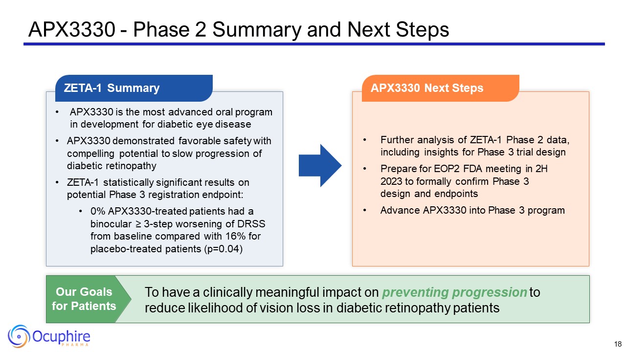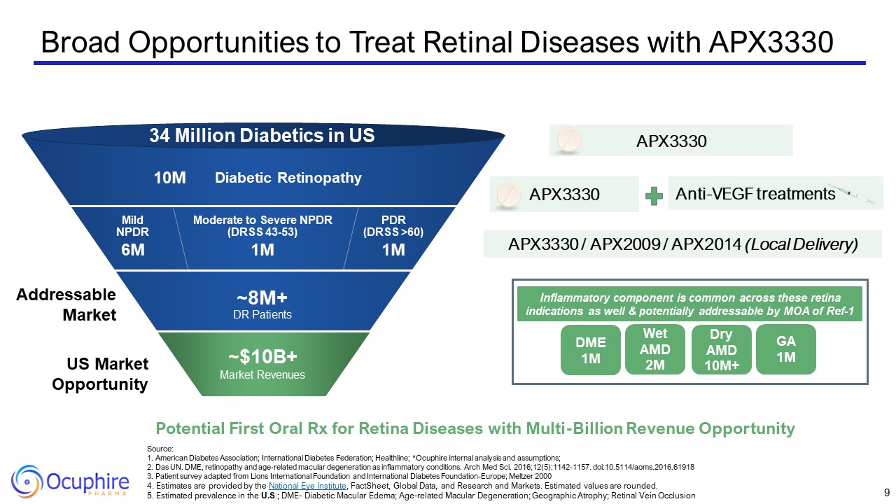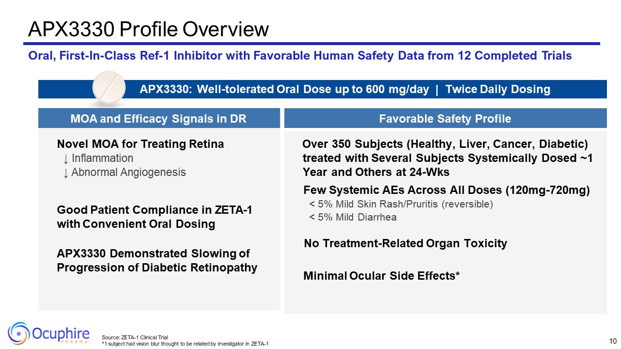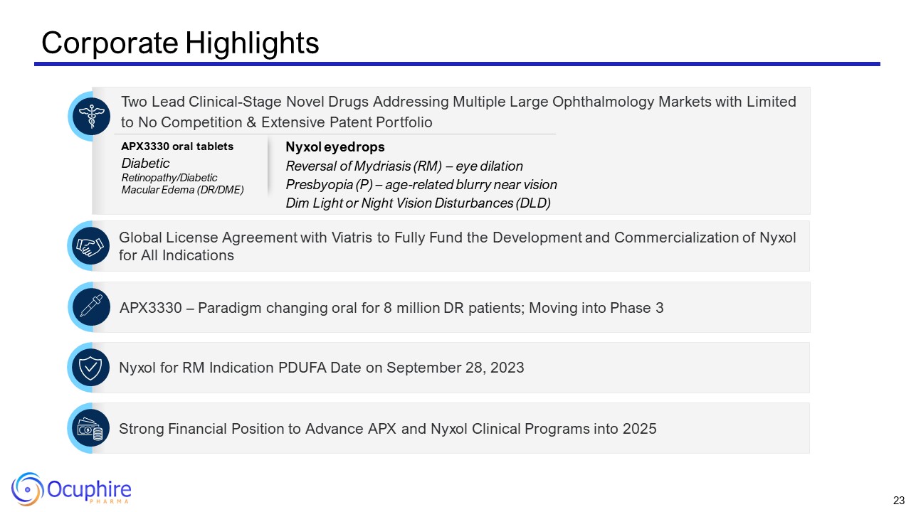 Corporate Highlights  Two Lead Clinical-Stage Novel Drugs Addressing Multiple Large Ophthalmology Markets with Limited to No Competition & Extensive Patent Portfolio  Global License Agreement with Viatris to Fund the Development and Commercialization of Nyxol for All Indications  Strong Financial Position to Advance APX 3330 and Nyxol Clinical Programs into 2025  Nyxol for RM Indication PDUFA Date on September 28, 2023  APX3330 – Paradigm Changing Oral Tablet for 8 million DR patients; Moving into Phase 3   APX3330 oral tablets  Diabetic Retinopathy/Diabetic Macular Edema (DR/DME)  Nyxol eyedrops  Reversal of Mydriasis (RM) – eye dilation  Presbyopia (P) – age-related blurry near vision  Dim Light or Night Vision Disturbances (DLD)  3