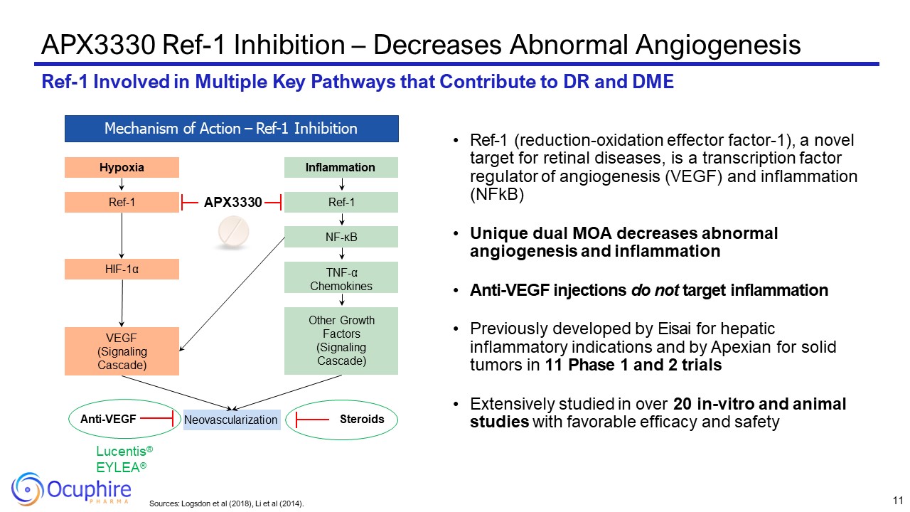 APX3330 Profile Overview  Oral, First-In-Class Ref-1 Inhibitor with Favorable Human Safety Data from 12 Completed Trials  Novel MOA for Treating Retina  ↓ Inflammation  ↓ Abnormal Angiogenesis  Good Patient Compliance in ZETA-1 with Convenient Oral Dosing  APX3330 Demonstrated Slowing of Progression of Diabetic Retinopathy  Over 350 Subjects (Healthy, Liver, Cancer, Diabetic) treated with Several Subjects Systemically Dosed ~1 Year and Others at 24-Wks  Few Systemic AEs Across All Doses (120mg-720mg)  < 5% Mild Skin Rash/Pruritis (reversible)  < 5% Mild Diarrhea  No Treatment-Related Organ Toxicity  Minimal Ocular Side Effects*  APX3330: Well-tolerated Oral Dose up to 600 mg/day | Twice Daily Dosing  MOA and Efficacy Signals in DR Favorable Safety Profile  10  Source: ZETA-1 Clinical Trial  *1 subject had vision blur thought to be related by investigator in ZETA-1
