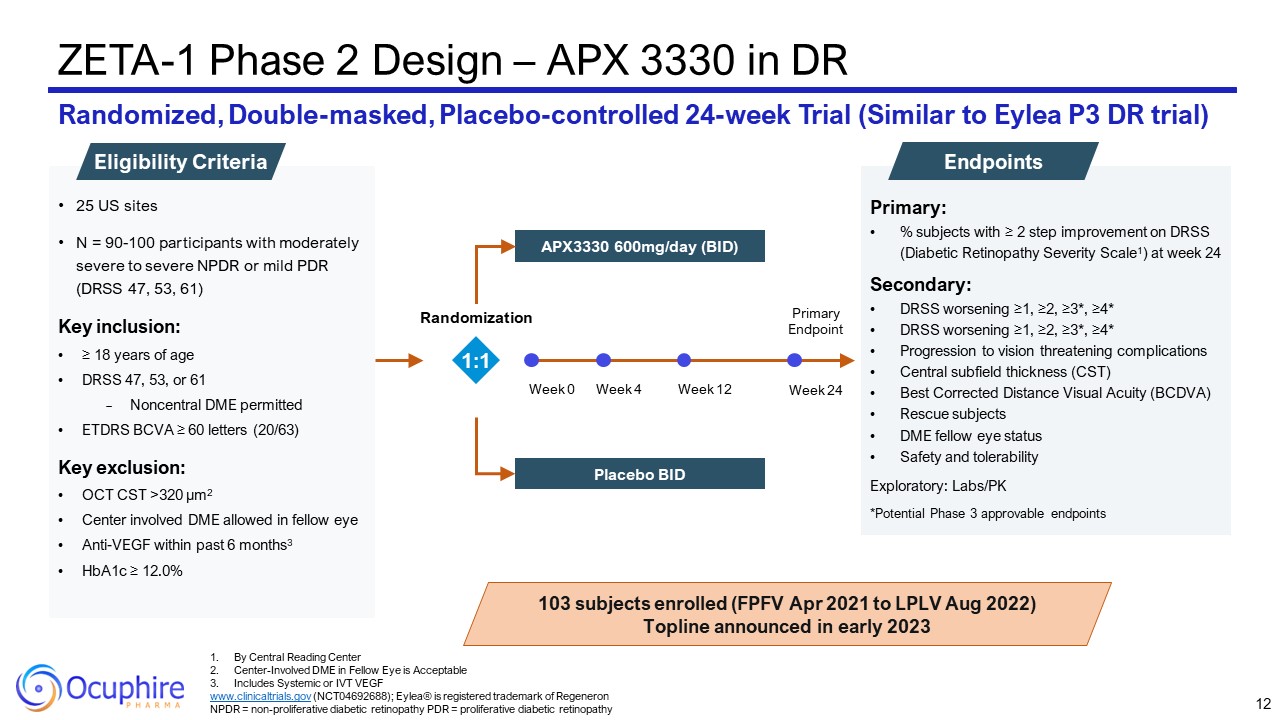 Primary:   % subjects with ≥ 2 step improvement on DRSS (Diabetic Retinopathy Severity Scale1) at week 24  Secondary:  DRSS worsening ≥1, ≥2, ≥3*, ≥4*  DRSS worsening ≥1, ≥2, ≥3*, ≥4*  Progression to vision threatening complications  Central subfield thickness (CST)  Best Corrected Distance Visual Acuity (BCDVA)  Rescue subjects  DME fellow eye status  Safety and tolerability  Exploratory: Labs/PK  *Potential Phase 3 approvable endpoints  ZETA-1 Phase 2 Design – APX 3330 in DR  Randomized, Double-masked, Placebo-controlled 24-week Trial (Similar to Eylea P3 DR trial)  Endpoints  25 US sites  N = 90-100 participants with moderately severe to severe NPDR or mild PDR (DRSS 47, 53, 61)  Key inclusion:  ≥ 18 years of age  DRSS 47, 53, or 61  Noncentral DME permitted  ETDRS BCVA ≥ 60 letters (20/63)  Key exclusion:  OCT CST >320 µm2  Center involved DME allowed in fellow eye  Anti-VEGF within past 6 months3  HbA1c ≥ 12.0%  Eligibility Criteria  103 subjects enrolled (FPFV Apr 2021 to LPLV Aug 2022)  Topline announced in early 2023  1:1  By Central Reading Center  Center-Involved DME in Fellow Eye is Acceptable  Includes Systemic or IVT VEGF  www.clinicaltrials.gov (NCT04692688); Eylea® is registered trademark of Regeneron  NPDR = non-proliferative diabetic retinopathy PDR = proliferative diabetic retinopathy  12  Week 0  Week 12  Week 24  Week 4  Primary Endpoint  APX3330 600mg/day (BID)  Placebo BID  Randomization