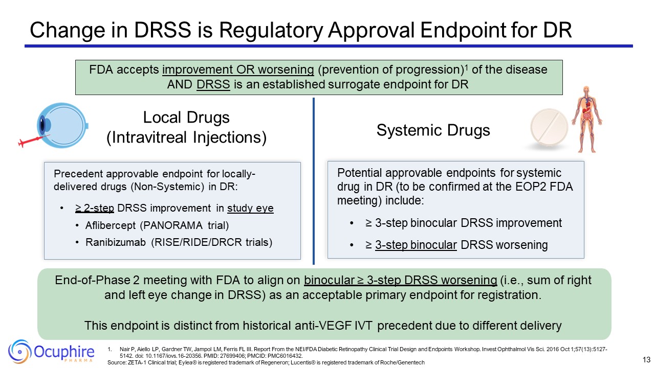 Change in DRSS is Regulatory Approval Endpoint for DR  Local Drugs (Intravitreal Injections)  Systemic Drugs  Precedent approvable endpoint for locally- delivered drugs (Non-Systemic) in DR:  ≥ 2-step DRSS improvement in study eye  Aflibercept (PANORAMA trial)  Ranibizumab (RISE/RIDE/DRCR trials)  Potential approvable endpoints for systemic drug in DR (to be confirmed at the EOP2 FDA meeting) include:  ≥ 3-step binocular DRSS improvement  ≥ 3-step binocular DRSS worsening  End-of-Phase 2 meeting with FDA to align on binocular ≥ 3-step DRSS worsening (i.e., sum of right and left eye change in DRSS) as an acceptable primary endpoint for registration.  This endpoint is distinct from historical anti-VEGF IVT precedent due to different delivery  FDA accepts improvement OR worsening (prevention of progression)1 of the disease AND DRSS is an established surrogate endpoint for DR  13  Nair P, Aiello LP, Gardner TW, Jampol LM, Ferris FL III. Report From the NEI/FDA Diabetic Retinopathy Clinical Trial Design and Endpoints Workshop. Invest Ophthalmol Vis Sci. 2016 Oct 1;57(13):5127-5142. doi: 10.1167/iovs.16-20356. PMID: 27699406; PMCID: PMC6016432.  Source: ZETA-1 Clinical trial; Eylea® is registered trademark of Regeneron; Lucentis® is registered trademark of Roche/Genentech