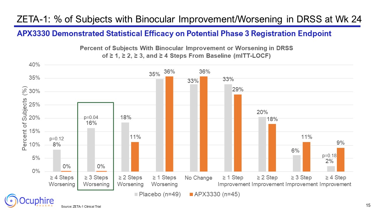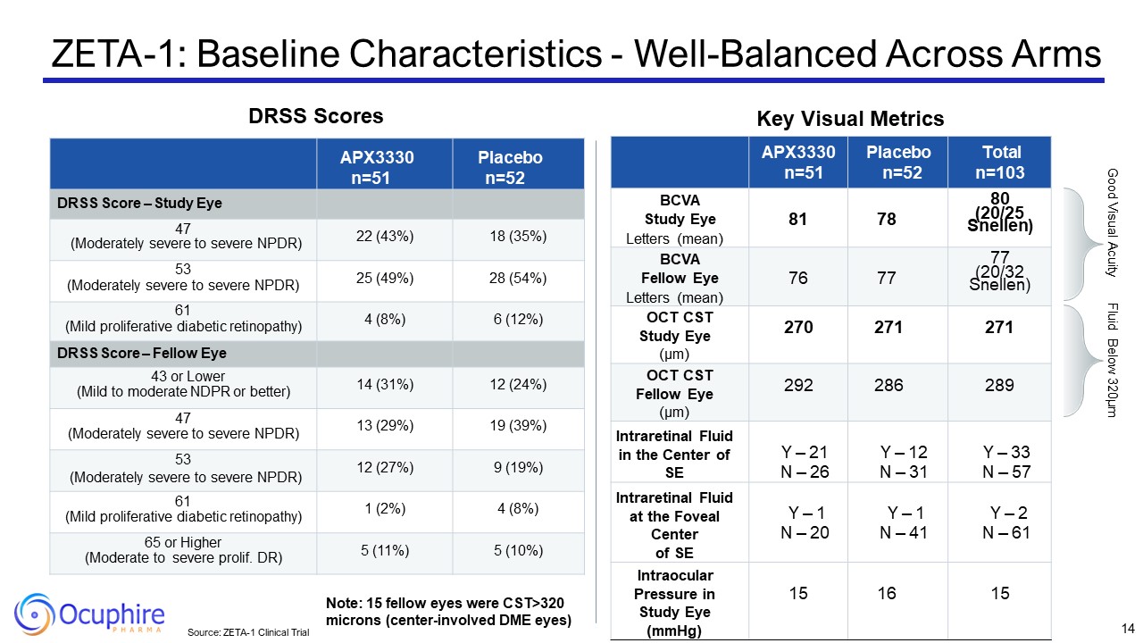 Source: ZETA-1 Clinical Trial  Key Visual Metrics  APX3330 n=51  Placebo n=52  Total n=103  BCVA  Study Eye  Letters (mean)  81  78  80  (20/25  Snellen)  BCVA  Fellow Eye  Letters (mean)  76  77  77  (20/32  Snellen)  OCT CST  Study Eye  (µm)  270  271  271  OCT CST  Fellow Eye  (µm)  292  286  289  Intraretinal Fluid in the Center of SE  Y – 21  N – 26  Y – 12  N – 31  Y – 33  N – 57  Intraretinal Fluid at the Foveal Center of SE  Y – 1  N – 20  Y – 1  N – 41  Y – 2  N – 61  Intraocular Pressure in Study Eye (mmHg)  15  16  15  APX3330 n=51  Placebo n=52  DRSS Score – Study Eye  47 (Moderately severe to severe NPDR)  22 (43%)  18 (35%)  53 (Moderately severe to severe NPDR)  25 (49%)  28 (54%)  61 (Mild proliferative diabetic retinopathy)  4 (8%)  6 (12%)  DRSS Score – Fellow Eye  43 or Lower (Mild to moderate NDPR or better)  14 (31%)  12 (24%)  47 (Moderately severe to severe NPDR)  13 (29%)  19 (39%)  53   (Moderately severe to severe NPDR)  12 (27%)  9 (19%)  61 (Mild proliferative diabetic retinopathy)  1 (2%)  4 (8%)  65 or Higher (Moderate to severe prolif. DR)  5 (11%)  5 (10%)  Good Visual Acuity  Fluid Below 320µm  Note: 15 fellow eyes were CST>320 microns (center-involved DME eyes)  ZETA-1: Baseline Characteristics - Well-Balanced Across Arms  14  DRSS Scores