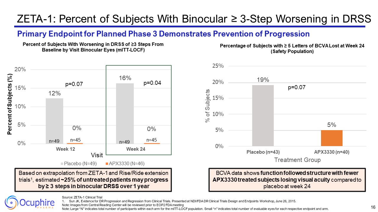 ZETA-1: % of Subjects with Binocular Improvement/Worsening in DRSS at Wk 24  APX3330 Demonstrated Statistical Efficacy on Potential Phase 3 Registration Endpoint  p=0.12  8%  p=0.04  16%  18%  35%  33%  33%  20%  6%  p=0.18  2%  0%  0%  11%  36% 36%  29%  18%  11%   9%   0%  5%  10%  15%  20%  25%  30%  35%  40%  ≥ 4 Steps  Worsening  ≥ 3 Steps  Worsening  ≥ 2 Steps  Worsening  ≥ 1 Steps  Worsening  No Change  ≥ 1 Step ≥ 2 Step ≥ 3 Step ≥ 4 Step  Improvement Improvement Improvement Improvement  Percent of Subjects (%)  Percent of Subjects With Binocular Improvement or Worsening in DRSS  of ≥ 1, ≥ 2, ≥ 3, and ≥ 4 Steps From Baseline (mITT-LOCF)  Placebo (n=49)  APX3330 (n=45)  15  Source: ZETA-1 Clinical Trial
