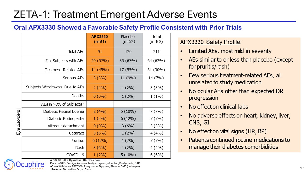 APX3330 SAEs: Dyskinesia, TIA, Chest pain  Placebo SAEs: Vertigo, Asthenia, Multiple organ dysfunction, Bradycardia, CAD  AEs → Withdrawal APX3330: Presyncope, Dyspnea; Placebo: DME (both eyes)  *Preferred Term within Organ Class  ZETA-1: Treatment Emergent Adverse Events  Oral APX3330 Showed a Favorable Safety Profile Consistent with Prior Trials  APX3330 (n=51)  Placebo (n=52)  Total (n=103)  Total AEs  91  120  211  # of Subjects with AEs  29 (57%)  35 (67%)  64 (62%)  Treatment Related AEs  14 (45%)  17 (55%)  31 (30%)  Serious AEs  3 (3%)  11 (9%)  14 (7%)  Subjects Withdrawals Due to AEs  2 (4%)  1 (2%)  3 (3%)  Deaths  0 (0%)  1 (2%)  1 (1%)  AEs in >5% of Subjects*  Diabetic Retinal Edema  2 (4%)  5 (10%)  7 (7%)  Diabetic Retinopathy  1 (2%)  6 (12%)  7 (7%)  Vitreous detachment  0 (0%)  3 (6%)  3 (3%)  Cataract  3 (6%)  1 (2%)  4 (4%)  Pruritus  6 (12%)  1 (2%)  7 (7%)  Rash  3 (6%)  1 (2%)  4 (4%)  COVID-19  1 (2%)  5 (10%)  6 (6%)  APX3330 Safety Profile:  Limited AEs, most mild in severity  AEs similar to or less than placebo (except for pruritis/rash)  Few serious treatment-related AEs, all unrelated to study medication  No ocular AEs other than expected DR progression  No effect on clinical labs  No adverse effects on heart, kidney, liver, CNS, GI  No effect on vital signs (HR, BP)  Patients continued routine medications to manage their diabetes comorbidities  | Eye disorders |  17