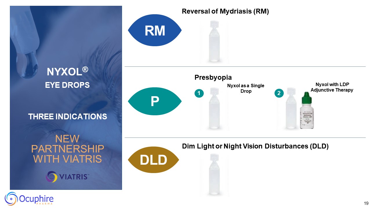 19  Reversal of Mydriasis (RM)  P  DLD  Presbyopia  Dim Light or Night Vision Disturbances (DLD)  Nyxol as a Single Drop  Nyxol with LDP Adjunctive Therapy  1  0.4%  2  RM  RM  NYXOL®  EYE DROPS  THREE INDICATIONS  NEW PARTNERSHIP WITH VIATRIS