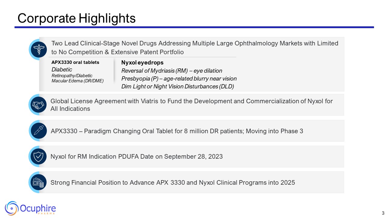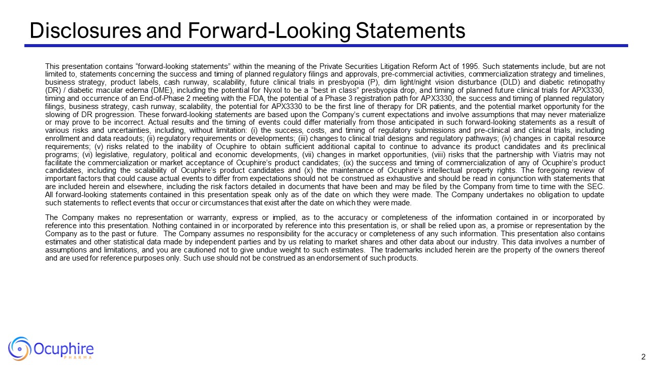 Disclosures and Forward-Looking Statements  This presentation contains “forward-looking statements” within the meaning of the Private Securities Litigation Reform Act of 1995. Such statements include, but are not limited to, statements concerning the success and timing of planned regulatory filings and approvals, pre-commercial activities, commercialization strategy and timelines, business strategy, product labels, cash runway, scalability, future clinical trials in presbyopia (P), dim light/night vision disturbance (DLD) and diabetic retinopathy (DR) / diabetic macular edema (DME), including the potential for Nyxol to be a “best in class” presbyopia drop, and timing of planned future clinical trials for APX3330, timing and occurrence of an End-of-Phase 2 meeting with the FDA, the potential of a Phase 3 registration path for APX3330, the success and timing of planned regulatory filings, business strategy, cash runway, scalability, the potential for APX3330 to be the first line of therapy for DR patients, and the potential market opportunity for the slowing of DR progression. These forward-looking statements are based upon the Company’s current expectations and involve assumptions that may never materialize or may prove to be incorrect. Actual results and the timing of events could differ materially from those anticipated in such forward-looking statements as a result of various risks and uncertainties, including, without limitation: (i) the success, costs, and timing of regulatory submissions and pre-clinical and clinical trials, including enrollment and data readouts; (ii) regulatory requirements or developments; (iii) changes to clinical trial designs and regulatory pathways; (iv) changes in capital resource requirements; (v) risks related to the inability of Ocuphire to obtain sufficient additional capital to continue to advance its product candidates and its preclinical programs; (vi) legislative, regulatory, political and economic developments, (vii) changes in market opportunities, (viii) risks that the partnership with Viatris may not facilitate the commercialization or market acceptance of Ocuphire’s product candidates; (ix) the success and timing of commercialization of any of Ocuphire’s product candidates, including the scalability of Ocuphire’s product candidates and (x) the maintenance of Ocuphire’s intellectual property rights. The foregoing review of important factors that could cause actual events to differ from expectations should not be construed as exhaustive and should be read in conjunction with statements that are included herein and elsewhere, including the risk factors detailed in documents that have been and may be filed by the Company from time to time with the SEC. All forward-looking statements contained in this presentation speak only as of the date on which they were made. The Company undertakes no obligation to update such statements to reflect events that occur or circumstances that exist after the date on which they were made.  The Company makes no representation or warranty, express or implied, as to the accuracy or completeness of the information contained in or incorporated by reference into this presentation. Nothing contained in or incorporated by reference into this presentation is, or shall be relied upon as, a promise or representation by the Company as to the past or future. The Company assumes no responsibility for the accuracy or completeness of any such information. This presentation also contains estimates and other statistical data made by independent parties and by us relating to market shares and other data about our industry. This data involves a number of assumptions and limitations, and you are cautioned not to give undue weight to such estimates. The trademarks included herein are the property of the owners thereof and are used for reference purposes only. Such use should not be construed as an endorsement of such products.  2