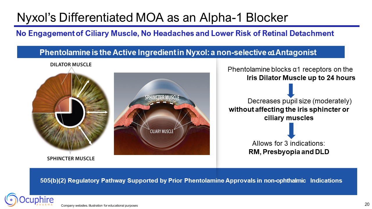 Decreases pupil size (moderately) without affecting the iris sphincter or ciliary muscles  Allows for 3 indications:  RM, Presbyopia and DLD  505(b)(2) Regulatory Pathway Supported by Prior Phentolamine Approvals in non-ophthalmic Indications  Nyxol’s Differentiated MOA as an Alpha-1 Blocker  No Engagement of Ciliary Muscle, No Headaches and Lower Risk of Retinal Detachment  Phentolamine is the Active Ingredient in Nyxol: a non-selective α1 Antagonist  Phentolamine blocks α1 receptors on the Iris Dilator Muscle up to 24 hours  20  Company websites. Illustration for educational purposes