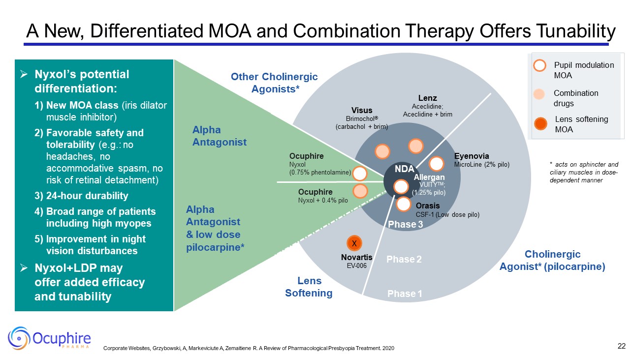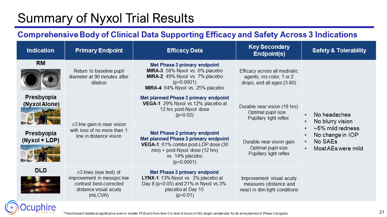 *Trend toward statistical significance even in smaller POS arm from time 0 to time 6 hours (n=30); larger sample size for all arms planned in Phase 3 program  Primary Endpoint  Efficacy Data  Key Secondary Endpoint(s)  Safety & Tolerability  Return to baseline pupil diameter at 90 minutes after dilation  Met Phase 3 primary endpoint MIRA-3: 58% Nyxol vs. 6% placebo  MIRA-2: 49% Nyxol vs. 7% placebo (p<0.0001)  MIRA-4: 64% Nyxol vs. 25% placebo  Efficacy across all mydriatic agents, iris color, 1 or 2 drops, and all ages (3-80)  No headaches  No blurry vision  ~5% mild redness  No change in IOP  No SAEs  Most AEs were mild  ≥3 line gain in near vision with loss of no more than 1 line in distance vision  Met planned Phase 3 primary endpoint VEGA-1: 29% Nyxol vs.12% placebo at 12 hrs post-Nyxol dose  (p=0.02)  Durable near vision (18 hrs) Optimal pupil size Pupillary light reflex  Met Phase 2 primary endpoint  Met planned Phase 3 primary endpoint VEGA-1: 61% combo post-LDP dose (30 min) + post-Nyxol dose (12 hrs)  vs. 14% placebo (p<0.0001)  Durable near vision gain Optimal pupil size Pupillary light reflex  ≥3 lines (eye test) of improvement in mesopic low contrast best-corrected distance visual acuity (mLCVA)  Met Phase 3 primary endpoint LYNX-1: 13% Nyxol vs. 3% placebo at Day 8 (p<0.05) and 21% in Nyxol vs.3%  placebo at Day 15 (p<0.01)  Improvement visual acuity measures (distance and near) in dim light conditions  Summary of Nyxol Trial Results  Comprehensive Body of Clinical Data Supporting Efficacy and Safety Across 3 Indications  RM  P: Nyxol  DLD  21  Indication  RM  Presbyopia (Nyxol Alone)  Presbyopia (Nyxol + LDP)  DLD