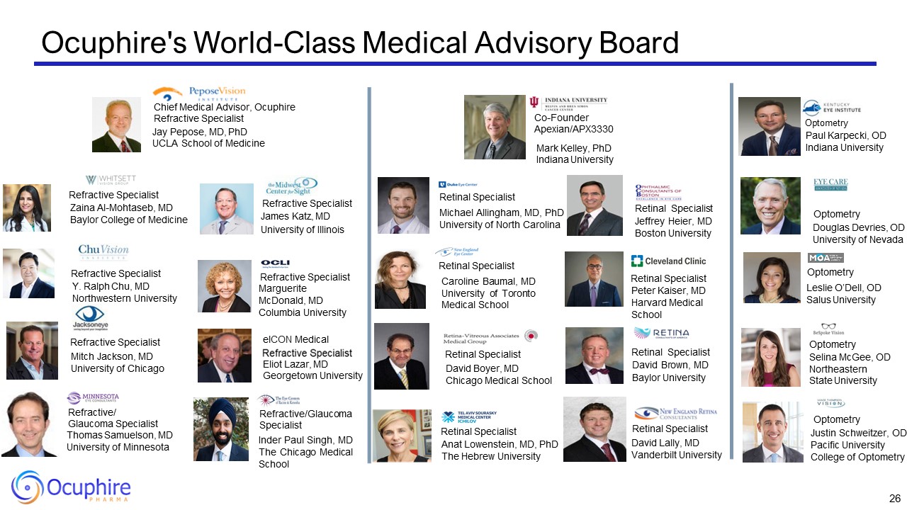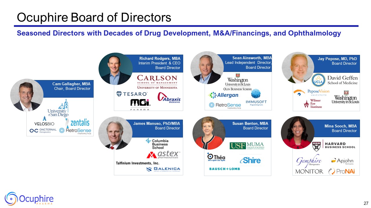 Ocuphire's World-Class Medical Advisory Board  Chief Medical Advisor, Ocuphire Refractive Specialist  Jay Pepose, MD, PhD UCLA School of Medicine  Refractive Specialist  Y. Ralph Chu, MD Northwestern University  Refractive Specialist  Zaina Al-Mohtaseb, MD Baylor College of Medicine  Refractive Specialist James Katz, MD University of Illinois  Refractive Specialist Marguerite McDonald, MD Columbia University  Refractive Specialist  Mitch Jackson, MD University of Chicago  Refractive/ Glaucoma Specialist  Thomas Samuelson, MD  University of Minnesota  Refractive/Glaucoma Specialist  Inder Paul Singh, MD The Chicago Medical School  Eliot Lazar, MD Georgetown University  elCON Medical  Retinal Specialist Peter Kaiser, MD Harvard Medical School  Retinal Specialist  David Lally, MD Vanderbilt University  Retinal Specialist  Michael Allingham, MD, PhD University of North Carolina  Retinal Specialist  David Boyer, MD Chicago Medical School  Retinal Specialist David Brown, MD Baylor University  Retinal Specialist Jeffrey Heier, MD Boston University  Retinal Specialist  Anat Lowenstein, MD, PhD The Hebrew University  Retinal Specialist  Caroline Baumal, MD University of Toronto Medical School  Optometry  Douglas Devries, OD University of Nevada  Optometry  Paul Karpecki, OD Indiana University  Optometry  Justin Schweitzer, OD Pacific University College of Optometry  Optometry  Selina McGee, OD Northeastern State University  Optometry  Leslie O’Dell, OD Salus University  Co-Founder Apexian/APX3330  Mark Kelley, PhD Indiana University  26