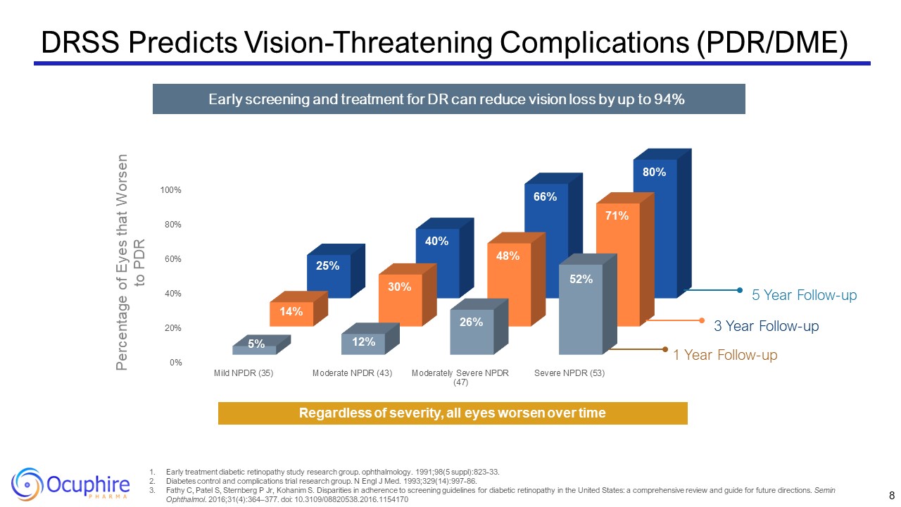 DRSS Predicts Vision-Threatening Complications (PDR/DME)  8  Early treatment diabetic retinopathy study research group. ophthalmology. 1991;98(5 suppl):823-33.   Diabetes control and complications trial research group. N Engl J Med. 1993;329(14):997-86.  Fathy C, Patel S, Sternberg P Jr, Kohanim S. Disparities in adherence to screening guidelines for diabetic retinopathy in the United States: a comprehensive review and guide for future directions. Semin Ophthalmol. 2016;31(4):364–377. doi: 10.3109/08820538.2016.1154170  Early screening and treatment for DR can reduce vision loss by up to 94%  1 Year Follow-up  3 Year Follow-up  5 Year Follow-up  Percentage of Eyes that Worsen to PDR  Regardless of severity, all eyes worsen over time