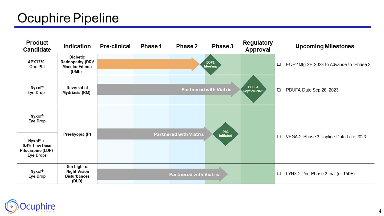 Product Candidate  Indication  Pre-clinical  Phase 1  Phase 2  Phase 3  Regulatory  Approval  Upcoming Milestones  APX3330   Oral Pill  Diabetic Retinopathy (DR)/ Macular Edema (DME)   EOP2 Mtg 2H 2023 to Advance to Phase 3   Nyxol®  Eye Drop   Reversal of Mydriasis (RM)   PDUFA Date Sep 28, 2023  Nyxol®  Eye Drop  Presbyopia (P)  VEGA-2 Phase 3 Topline Data Late 2023   Nyxol® +   0.4% Low Dose Pilocarpine (LDP)   Eye Drops  Nyxol® +   0.4% Low Dose Pilocarpine (LDP)   Eye Drops  Nyxol®  Eye Drop  Dim Light or   Night Vision Disturbances (DLD)  LYNX-2 2nd Phase 3 trial (n=150+)     Ocuphire Pipeline  Partnered with Viatris      Partnered with Viatris  Partnered with Viatris   EOP2  Meeting  PDUFA  Sept 28, 2023  Ph3  Initiated  4