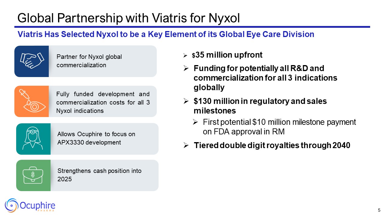 Global Partnership with Viatris for Nyxol  Viatris Has Selected Nyxol to be a Key Element of its Global Eye Care Division   Fully funded development and commercialization costs for all 3 Nyxol indications   Partner for Nyxol global commercialization   Allows Ocuphire to focus on APX3330 development  Strengthens cash position into 2025  $35 million upfront  Funding for potentially all R&D and commercialization for all 3 indications globally  $130 million in regulatory and sales milestones  First potential $10 million milestone payment on FDA approval in RM  Tiered double digit royalties through 2040  5