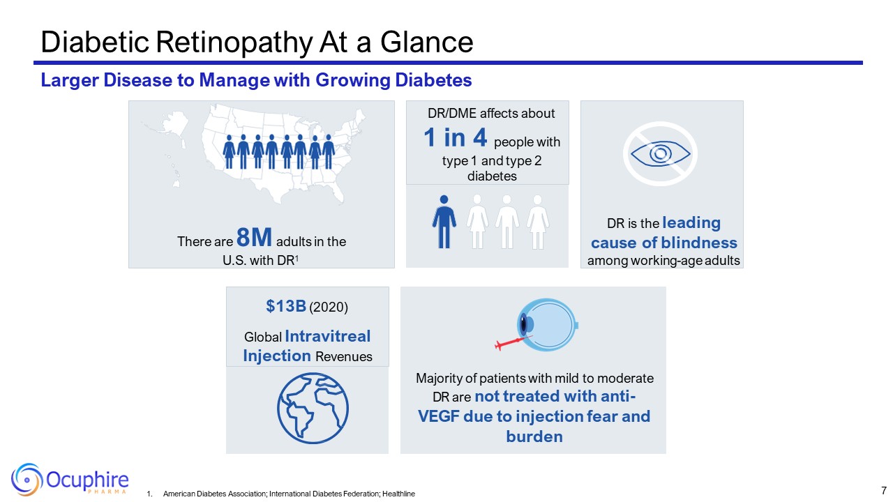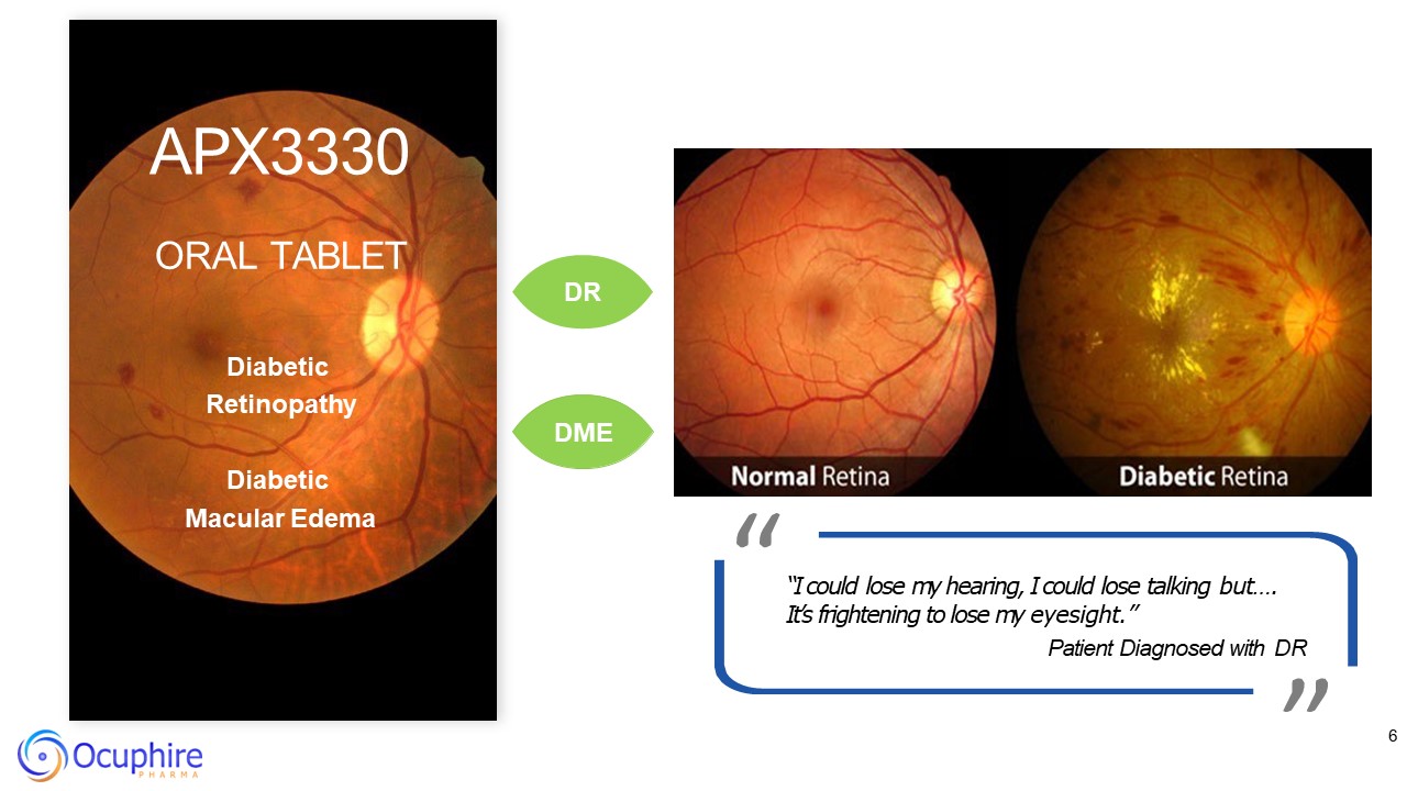 6  APX3330  ORAL TABLET  DR  Diabetic Retinopathy  DME  Diabetic Macular Edema  “  ”  “I could lose my hearing, I could lose talking but…. It’s frightening to lose my eyesight.”  Patient Diagnosed with DR