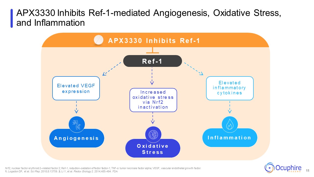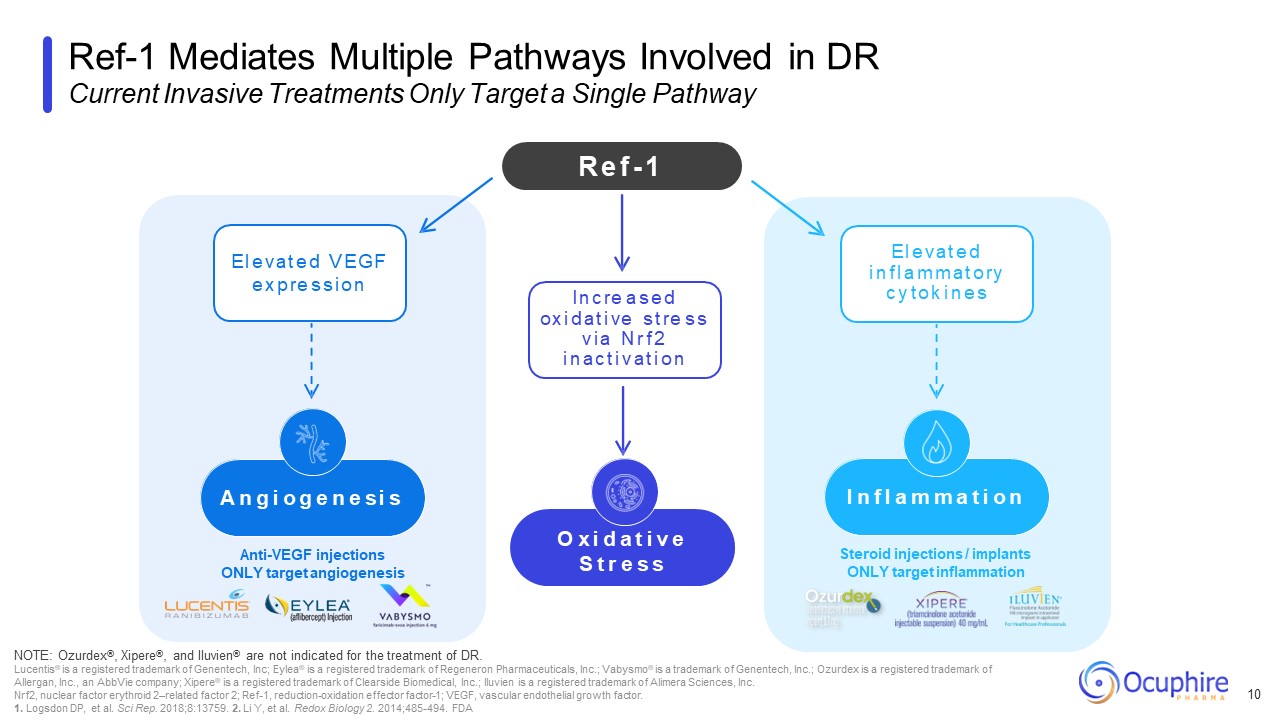 Steroid injections / implants ONLY target inflammation  Anti-VEGF injections ONLY target angiogenesis  Ref-1 Mediates Multiple Pathways Involved in DR  Current Invasive Treatments Only Target a Single Pathway  10  NOTE: Ozurdex®, Xipere®, and Iluvien® are not indicated for the treatment of DR.  Lucentis® is a registered trademark of Genentech, Inc; Eylea® is a registered trademark of Regeneron Pharmaceuticals, Inc.; Vabysmo® is a trademark of Genentech, Inc.; Ozurdex is a registered trademark of Allergan, Inc., an AbbVie company; Xipere® is a registered trademark of Clearside Biomedical, Inc.; Iluvien is a registered trademark of Alimera Sciences, Inc.  Nrf2, nuclear factor erythroid 2–related factor 2; Ref-1, reduction-oxidation effector factor-1; VEGF, vascular endothelial growth factor.  1. Logsdon DP, et al. Sci Rep. 2018;8:13759. 2. Li Y, et al. Redox Biology 2. 2014;485-494. FDA  R e f - 1  O x i d a t i v e S t r e s s  I n c re a s e d  ox i d a t i ve s t re s s v i a N r f 2  i n a c t i v a t i o n  E l e v a t e d V E G F e x p re s s i o n  A n g i o g e n e s i s  I n f l a m m a t i o n  E l e v a t e d  i n f l a m m a t o ry c y t o k i n e s