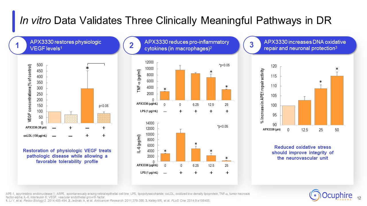 95  100  105  110  115  120  0  12.5  25  50  500  450  400  350  300  250  200  150  100  50  0  VEGF concentrations (% of control)  *  p<0.05  APX3330 restores physiologic  VEGF levels1  APX3330 (30 μm)  —  +  —  +  oxLDL (150 μg/mL)  —  —  +  +  TNF-⍺ (pg/ml)  IL-6 (pg/ml)  *  *  *  *p<0.05  *p<0.05  *  % increase in APE1 repair activity  *  Restoration of physiologic VEGF treats pathologic disease while allowing a favorable tolerability profile  Reduced oxidative stress should improve integrity of the neurovascular unit  *  *  *  In vitro Data Validates Three Clinically Meaningful Pathways in DR  APX3330 reduces pro-inflammatory  cytokines (in macrophages)2  APX3330 increases DNA oxidative  repair and neuronal protection3  14000  12000  10000  8000  6000  4000  2000  0  12000  10000  8000  6000  4000  2000  0  APX3330 (μg/mL)  0  0  6.25  12.5  25  LPS (1 μg/mL)  —  +  +  +  +  90  APX3330 (μm)  APX3330 (μg/mL)  0  0  6.25  12.5  25  LPS (1 μg/mL)  —  +  +  +  +  *  APE-1, apyrimidinic endonuclease 1; ARPE, spontaneously arising retinal epithelial cell line; LPS, lipopolysaccharide; oxLDL, oxidized low density lipoprotein, TNF-⍺, tumor necrosis factor-alpha; IL-6, interleukin 6; VEGF, vascular endothelial growth factor.  1. Li Y, et al. Redox Biology 2. 2014;485-494. 2. Jedinak A, et al. Anticancer Research. 2011;379-386. 3. Kelley MR, et al. PLoS One. 2014;9:e106485.  12  1  2  3