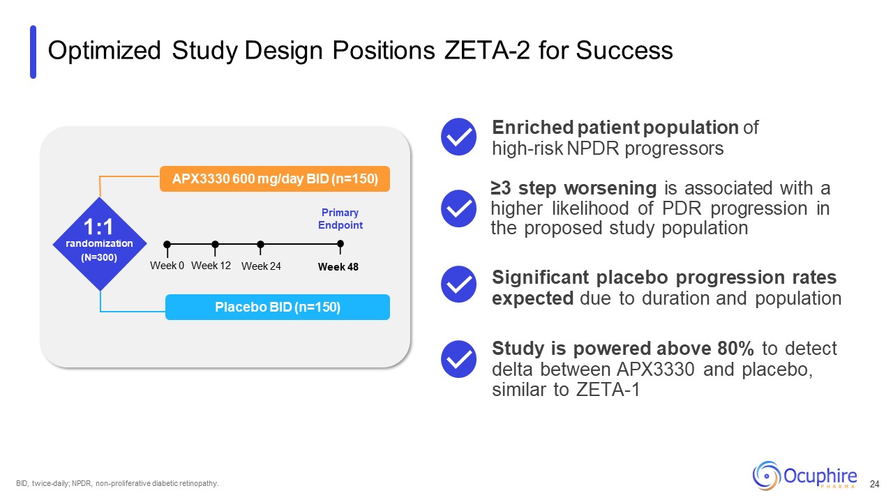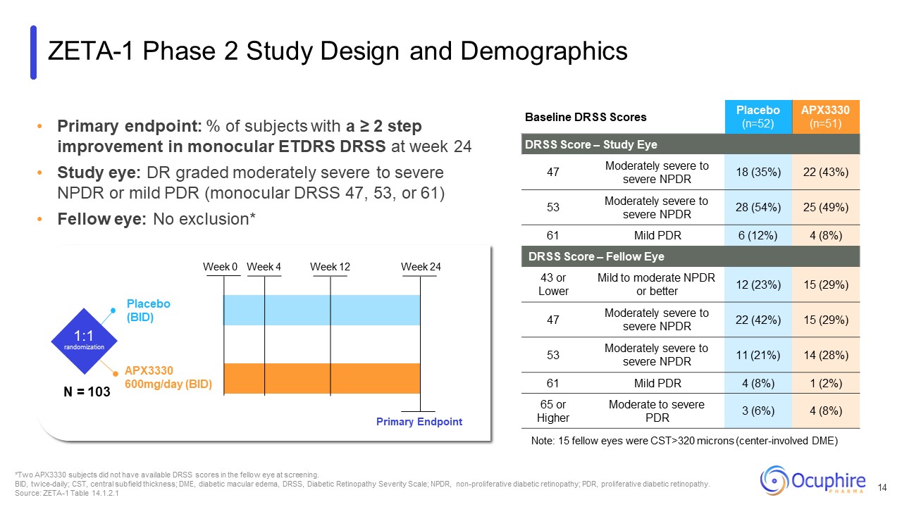 Primary endpoint: % of subjects with a ≥ 2 step improvement in monocular ETDRS DRSS at week 24  Study eye: DR graded moderately severe to severe  NPDR or mild PDR (monocular DRSS 47, 53, or 61)  Fellow eye: No exclusion*  Baseline DRSS Scores  Placebo  (n=52)  APX3330  (n=51)  DRSS Score – Study Eye  47  Moderately severe to  severe NPDR  18 (35%)  22 (43%)  53  Moderately severe to severe NPDR  28 (54%)  25 (49%)  61  Mild PDR  6 (12%)  4 (8%)  DRSS Score – Fellow Eye  43 or Lower  Mild to moderate NPDR or better  12 (23%)  15 (29%)  47  Moderately severe to  severe NPDR  22 (42%)  15 (29%)  53  Moderately severe to severe NPDR  11 (21%)  14 (28%)  61  Mild PDR  4 (8%)  1 (2%)  65 or  Higher  Moderate to severe  PDR  3 (6%)  4 (8%)  Note: 15 fellow eyes were CST>320 microns (center-involved DME)  *Two APX3330 subjects did not have available DRSS scores in the fellow eye at screening.  BID, twice-daily; CST, central subfield thickness; DME, diabetic macular edema, DRSS, Diabetic Retinopathy Severity Scale; NPDR, non-proliferative diabetic retinopathy; PDR, proliferative diabetic retinopathy.  Source: ZETA-1 Table 14.1.2.1  APX3330  600mg/day (BID)  Placebo (BID)  1:1  randomization  Week 0  Week 4  Week 12  Week 24  Primary Endpoint  ZETA-1 Phase 2 Study Design and Demographics  N = 103  14