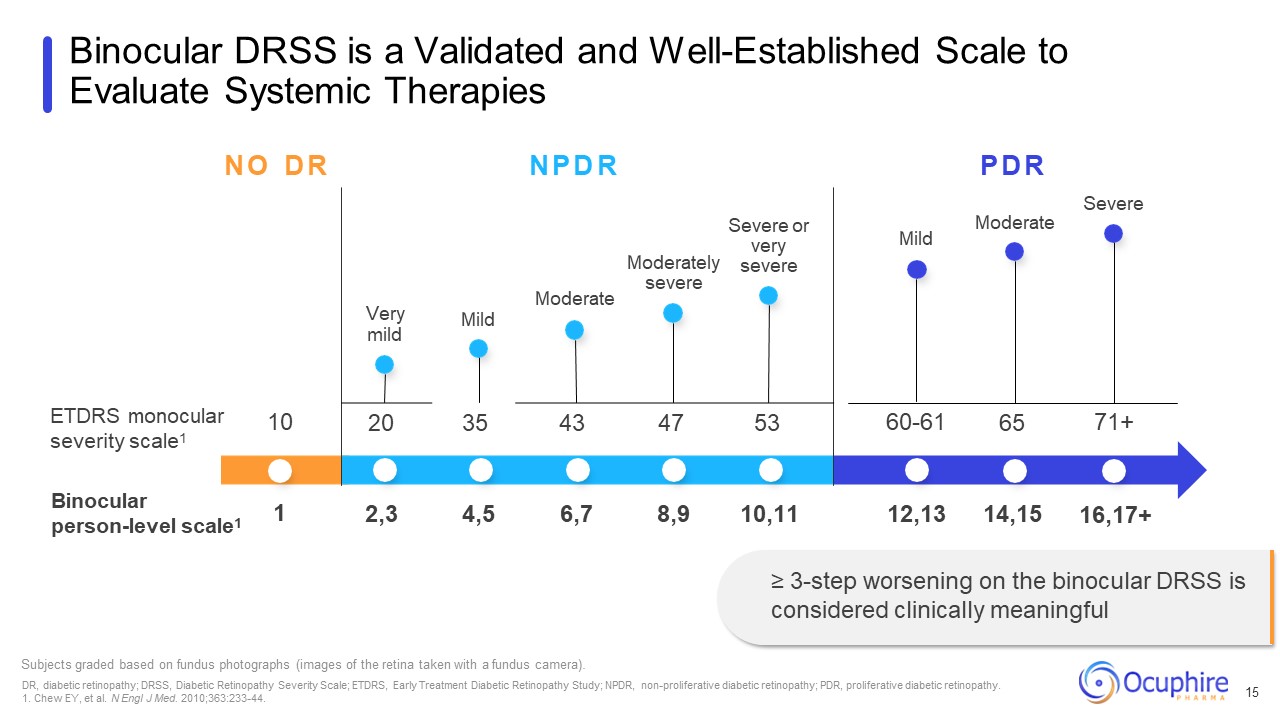 ETDRS monocular  severity scale1  Binocular  person-level scale1  Moderately severe  Severe or very severe  Mild  Subjects graded based on fundus photographs (images of the retina taken with a fundus camera).  DR, diabetic retinopathy; DRSS, Diabetic Retinopathy Severity Scale; ETDRS, Early Treatment Diabetic Retinopathy Study; NPDR, non-proliferative diabetic retinopathy; PDR, proliferative diabetic retinopathy.  1. Chew EY, et al. N Engl J Med. 2010;363:233-44.  Binocular DRSS is a Validated and Well-Established Scale to Evaluate Systemic Therapies  15  Moderate  N O D R N P D R P D R  Severe  Very  mild  Moderate  Mild  10  20  35  43  47  53  60-61  65  71+  1  2,3  4,5  6,7  8,9  10,11  12,13  14,15  16,17+  ≥ 3-step worsening on the binocular DRSS is considered clinically meaningful