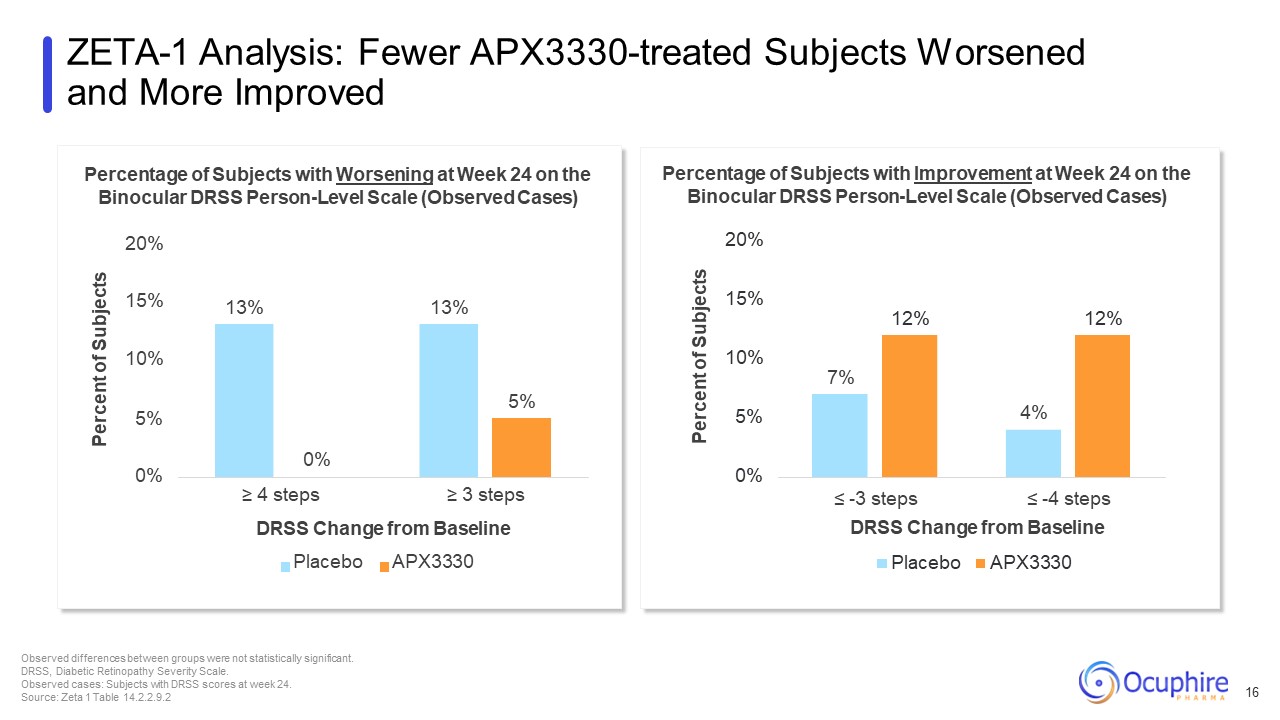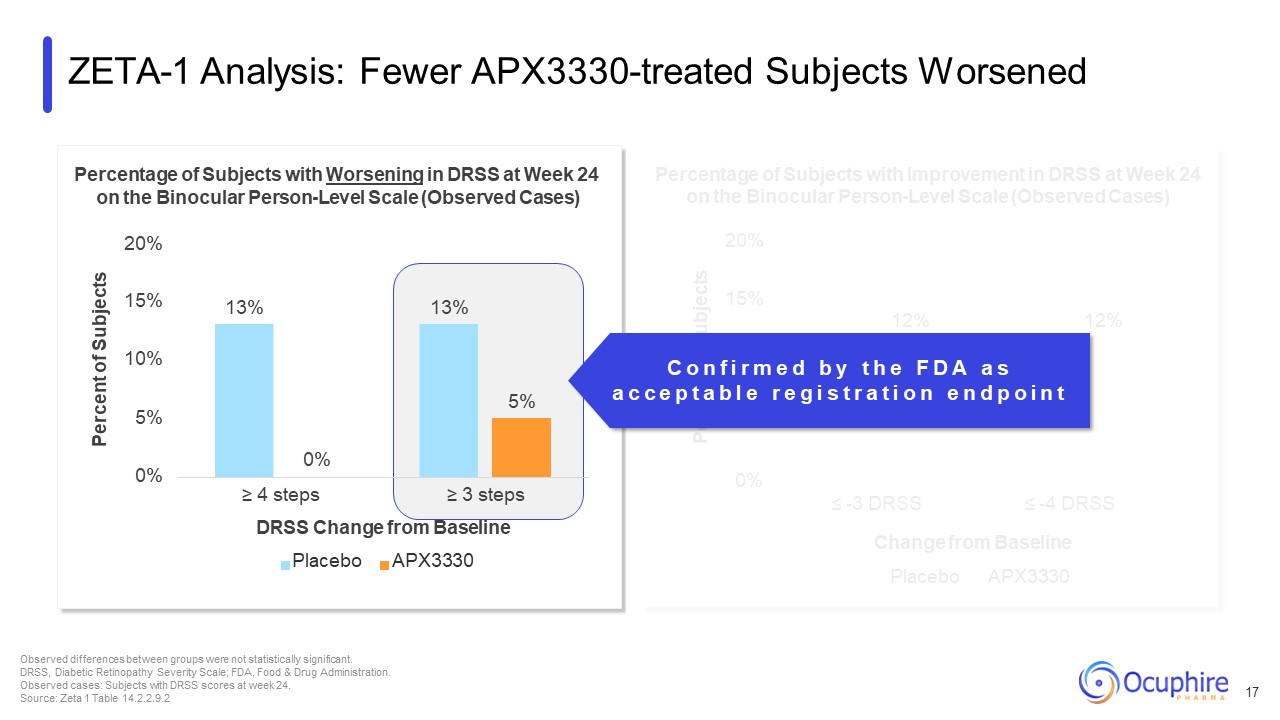 7%  4%  12%  12%  0%  5%  10%  15%  Percent of Subjects  ≤ -3 steps ≤ -4 steps  DRSS Change from Baseline  Placebo APX3330  Percentage of Subjects with Improvement at Week 24 on the Binocular DRSS Person-Level Scale (Observed Cases)  20%  13%  13%  5%  0%  10%  5%  15%  Percent of Subjects  0%  ≥ 4 steps ≥ 3 steps DRSS Change from Baseline Placebo APX3330  Percentage of Subjects with Worsening at Week 24 on the Binocular DRSS Person-Level Scale (Observed Cases)  20%  ZETA-1 Analysis: Fewer APX3330-treated Subjects Worsened and More Improved  Observed differences between groups were not statistically significant. DRSS, Diabetic Retinopathy Severity Scale.  Observed cases: Subjects with DRSS scores at week 24. Source: Zeta 1 Table 14.2.2.9.2  16