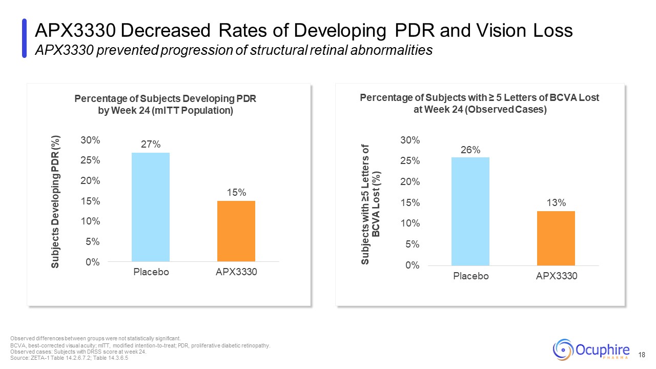20%  15%  12% 12%  10%  7%  5% 4%  0%  ≤ -3 DRSS ≤ -4 DRSS  Percent of Subjects  Percentage of Subjects with Improvement in DRSS at Week 24  on the Binocular Person-Level Scale (Observed Cases)  Change from Baseline  Placebo APX3330  ZETA-1 Analysis: Fewer APX3330-treated Subjects Worsened  17  Observed differences between groups were not statistically significant.  DRSS, Diabetic Retinopathy Severity Scale; FDA, Food & Drug Administration. Observed cases: Subjects with DRSS scores at week 24.  Source: Zeta 1 Table 14.2.2.9.2  13%  13%  5%  0%  5%  10%  15%  Percentage of Subjects with Worsening in DRSS at Week 24 on the Binocular Person-Level Scale (Observed Cases)  20%  Percent of Subjects  0%  ≥ 4 steps ≥ 3 steps DRSS Change from Baseline Placebo APX3330  C o n f i r m e d b y t h e F D A a s  a c c e p t a b l e r e g i s t r a t i o n e n d p o i n t