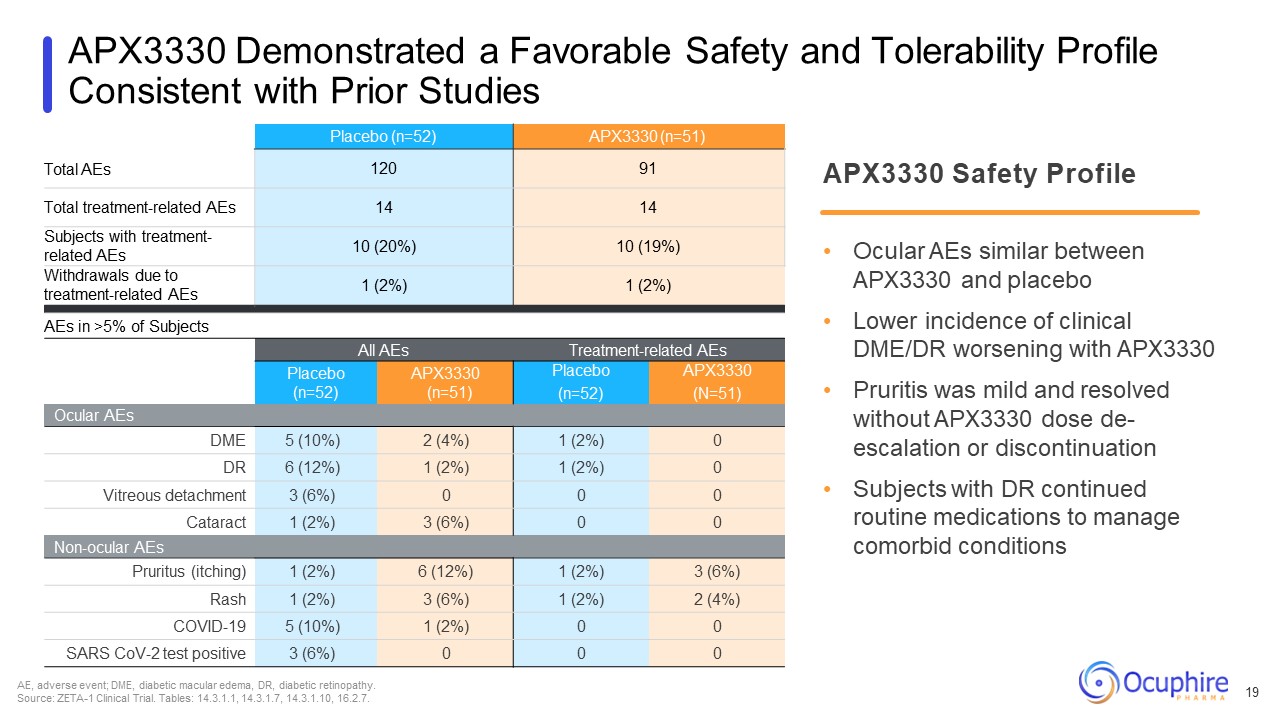 Percentage of Subjects Developing PDR  by Week 24 (mITT Population)  Percentage of Subjects with ≥ 5 Letters of BCVA Lost at Week 24 (Observed Cases)  26%  APX3330 Decreased Rates of Developing PDR and Vision Loss  APX3330 prevented progression of structural retinal abnormalities  Observed differences between groups were not statistically significant.  BCVA, best-corrected visual acuity; mITT, modified intention-to-treat; PDR, proliferative diabetic retinopathy. Observed cases: Subjects with DRSS score at week 24.  Source: ZETA-1 Table 14.2.6.7.2; Table 14.3.6.5  18  27%  15%  25%  20%  15%  10%  5%  0%  30%  Placebo  APX3330  Subjects Developing PDR (%)  13%  10%  5%  0%  25%  20%  15%  30%  Placebo  APX3330  Subjects with ≥5 Letters of BCVA Lost (%)