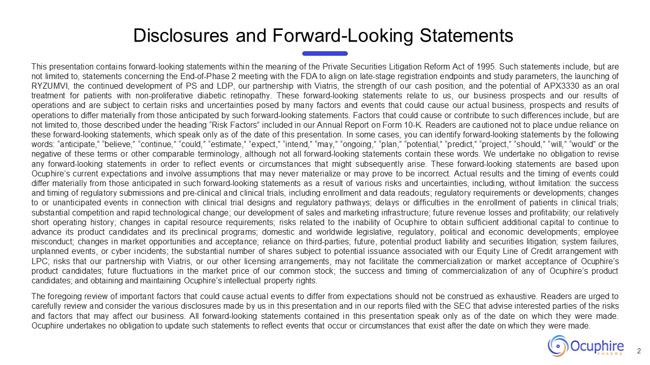 This presentation contains forward-looking statements within the meaning of the Private Securities Litigation Reform Act of 1995. Such statements include, but are not limited to, statements concerning the End-of-Phase 2 meeting with the FDA to align on late-stage registration endpoints and study parameters, the launching of RYZUMVI, the continued development of PS and LDP, our partnership with Viatris, the strength of our cash position, and the potential of APX3330 as an oral treatment for patients with non-proliferative diabetic retinopathy. These forward-looking statements relate to us, our business prospects and our results of operations and are subject to certain risks and uncertainties posed by many factors and events that could cause our actual business, prospects and results of operations to differ materially from those anticipated by such forward-looking statements. Factors that could cause or contribute to such differences include, but are not limited to, those described under the heading “Risk Factors” included in our Annual Report on Form 10-K. Readers are cautioned not to place undue reliance on these forward-looking statements, which speak only as of the date of this presentation. In some cases, you can identify forward-looking statements by the following words: “anticipate,” “believe,” “continue,” “could,” “estimate,” “expect,” “intend,” “may,” “ongoing,” “plan,” “potential,” “predict,” “project,” “should,” “will,” “would” or the negative of these terms or other comparable terminology, although not all forward-looking statements contain these words. We undertake no obligation to revise any forward-looking statements in order to reflect events or circumstances that might subsequently arise. These forward-looking statements are based upon Ocuphire’s current expectations and involve assumptions that may never materialize or may prove to be incorrect. Actual results and the timing of events could differ materially from those anticipated in such forward-looking statements as a result of various risks and uncertainties, including, without limitation: the success and timing of regulatory submissions and pre-clinical and clinical trials, including enrollment and data readouts; regulatory requirements or developments; changes to or unanticipated events in connection with clinical trial designs and regulatory pathways; delays or difficulties in the enrollment of patients in clinical trials; substantial competition and rapid technological change; our development of sales and marketing infrastructure; future revenue losses and profitability; our relatively short operating history; changes in capital resource requirements; risks related to the inability of Ocuphire to obtain sufficient additional capital to continue to advance its product candidates and its preclinical programs; domestic and worldwide legislative, regulatory, political and economic developments; employee misconduct; changes in market opportunities and acceptance; reliance on third-parties; future, potential product liability and securities litigation; system failures, unplanned events, or cyber incidents; the substantial number of shares subject to potential issuance associated with our Equity Line of Credit arrangement with LPC; risks that our partnership with Viatris, or our other licensing arrangements, may not facilitate the commercialization or market acceptance of Ocuphire’s product candidates; future fluctuations in the market price of our common stock; the success and timing of commercialization of any of Ocuphire’s product candidates; and obtaining and maintaining Ocuphire’s intellectual property rights.  The foregoing review of important factors that could cause actual events to differ from expectations should not be construed as exhaustive. Readers are urged to carefully review and consider the various disclosures made by us in this presentation and in our reports filed with the SEC that advise interested parties of the risks and factors that may affect our business. All forward-looking statements contained in this presentation speak only as of the date on which they were made. Ocuphire undertakes no obligation to update such statements to reflect events that occur or circumstances that exist after the date on which they were made.  2  Disclosures and Forward-Looking Statements