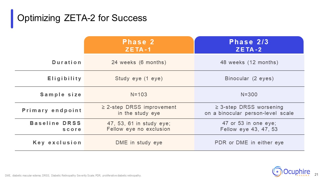 Optimizing ZETA-2 for Success  D u r a t i o n  24 weeks (6 months)  48 weeks (12 months)  E l i g i b i l i t y  Study eye (1 eye)  Binocular (2 eyes)  S a m p l e s i z e  N=103  N=300  P r i m a r y e n d p o i n t  ≥ 2-step DRSS improvement  in the study eye  ≥ 3-step DRSS worsening  on a binocular person-level scale  B a s e l i n e D R S S  s c o r e  47, 53, 61 in study eye; Fellow eye no exclusion  47 or 53 in one eye;  Fellow eye 43, 47, 53  K e y e x c l u s i o n  DME in study eye  PDR or DME in either eye  P h a s e 2  Z E TA - 1  P h a s e 2 / 3  Z E TA - 2  DME, diabetic macular edema; DRSS, Diabetic Retinopathy Severity Scale; PDR, proliferative diabetic retinopathy.  21