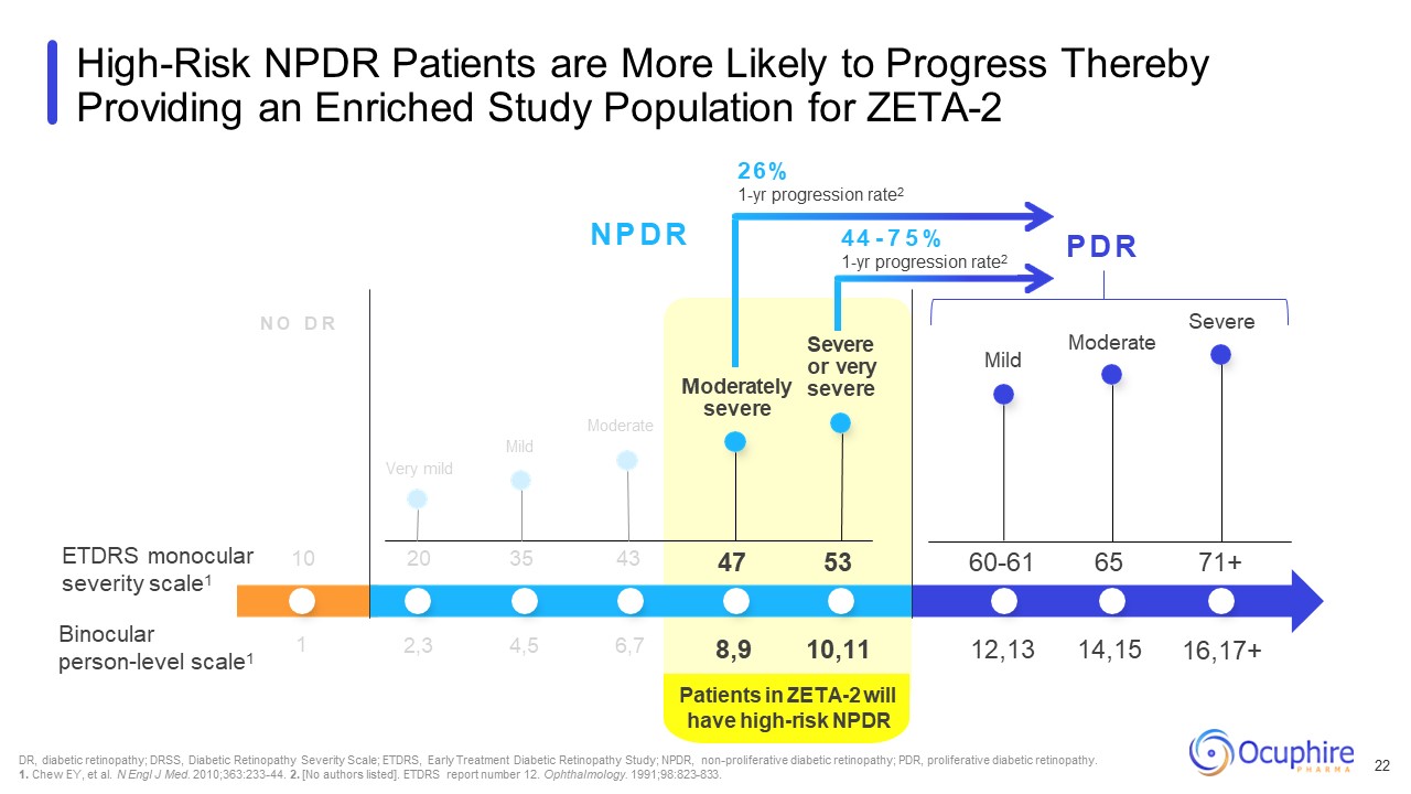 Patients in ZETA-2 will  have high-risk NPDR  N O D R  N P D R  P D R  ETDRS monocular  severity scale1  Binocular  person-level scale1  Very mild  Moderate  Mild  Moderately severe  Severe or very severe  Mild  DR, diabetic retinopathy; DRSS, Diabetic Retinopathy Severity Scale; ETDRS, Early Treatment Diabetic Retinopathy Study; NPDR, non-proliferative diabetic retinopathy; PDR, proliferative diabetic retinopathy.  1. Chew EY, et al. N Engl J Med. 2010;363:233-44. 2. [No authors listed]. ETDRS report number 12. Ophthalmology. 1991;98:823-833.  High-Risk NPDR Patients are More Likely to Progress Thereby Providing an Enriched Study Population for ZETA-2  10  20  35  43  Moderate  Severe  2,3  4,5  6,7  47  53  60-61  65  71+  8,9  10,11  12,13  14,15  16,17+  1  26%   1-yr progression rate2  44 - 7 5 %  1-yr progression rate2  22