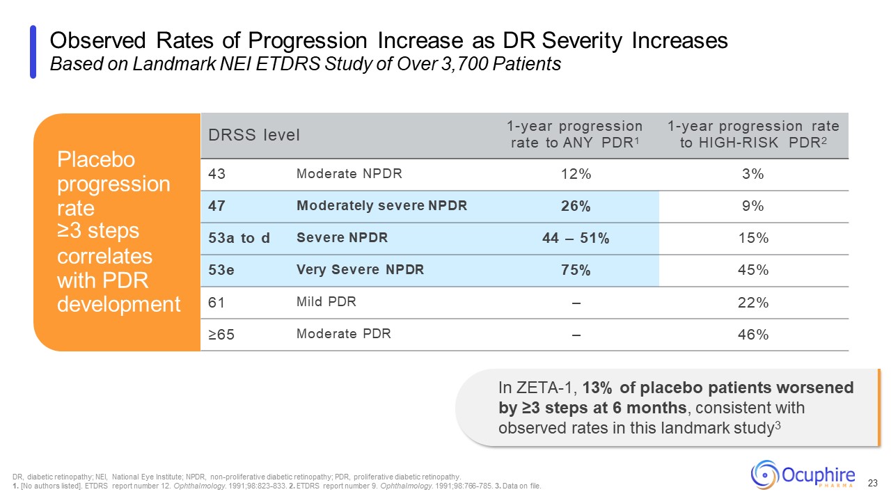 Observed Rates of Progression Increase as DR Severity Increases  Based on Landmark NEI ETDRS Study of Over 3,700 Patients  23  DRSS level  1-year progression  rate to ANY PDR1  1-year progression rate  to HIGH-RISK PDR2  43  Moderate NPDR  12%  3%  47  Moderately severe NPDR  26%  9%  53a to d  Severe NPDR  44 – 51%  15%  53e  Very Severe NPDR  75%  45%  61  Mild PDR  –  22%  ≥65  Moderate PDR  –  46%  Placebo progression rate  ≥3 steps  correlates with PDR development  In ZETA-1, 13% of placebo patients worsened by ≥3 steps at 6 months, consistent with observed rates in this landmark study3  DR, diabetic retinopathy; NEI, National Eye Institute; NPDR, non-proliferative diabetic retinopathy; PDR, proliferative diabetic retinopathy.  1. [No authors listed]. ETDRS report number 12. Ophthalmology. 1991;98:823-833. 2. ETDRS report number 9. Ophthalmology. 1991;98:766-785. 3. Data on file.
