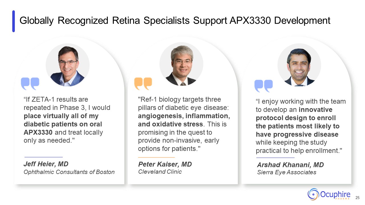 Jeff Heier, MD  Ophthalmic Consultants of Boston  “If ZETA-1 results are repeated in Phase 3, I would place virtually all of my diabetic patients on oral APX3330 and treat locally only as needed."  "Ref-1 biology targets three pillars of diabetic eye disease: angiogenesis, inflammation, and oxidative stress. This is promising in the quest to provide non-invasive, early options for patients."  Peter Kaiser, MD  Cleveland Clinic  “I enjoy working with the team to develop an innovative protocol design to enroll the patients most likely to have progressive disease while keeping the study practical to help enrollment."  Arshad Khanani, MD  Sierra Eye Associates  Globally Recognized Retina Specialists Support APX3330 Development  25
