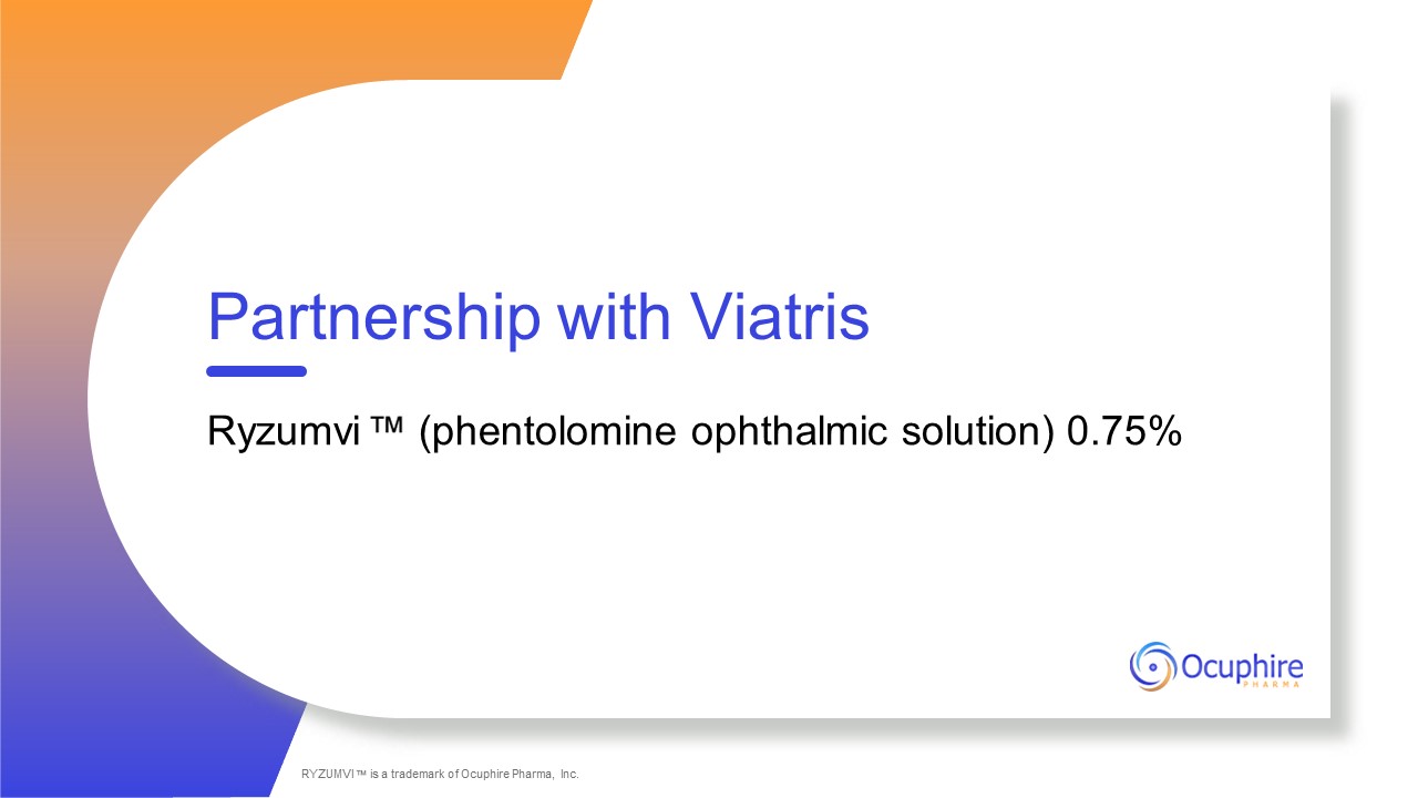 Partnership with Viatris  Ryzumvi (phentolomine ophthalmic solution) 0.75%  RYZUMVI is a trademark of Ocuphire Pharma, Inc.