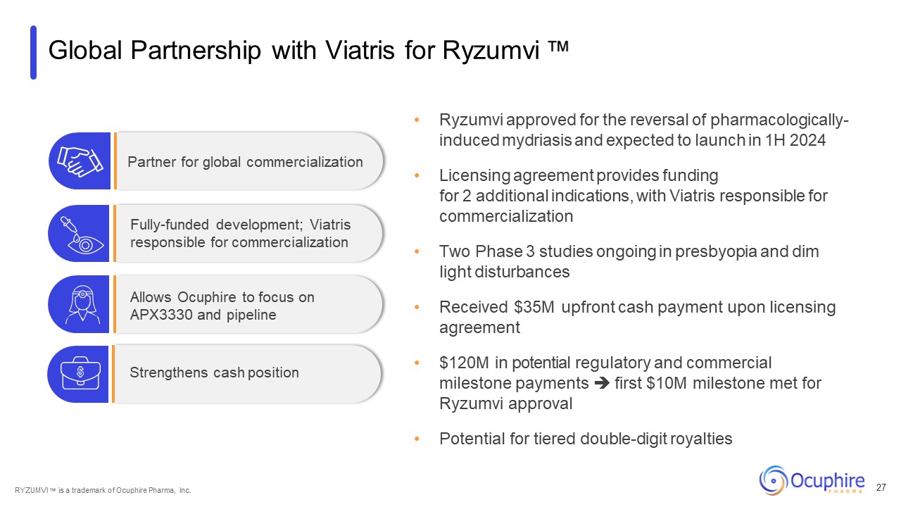 Global Partnership with Viatris for Ryzumvi  Ryzumvi approved for the reversal of pharmacologically-  induced mydriasis and expected to launch in 1H 2024  Licensing agreement provides funding  for 2 additional indications, with Viatris responsible for commercialization  Two Phase 3 studies ongoing in presbyopia and dim light disturbances  Received $35M upfront cash payment upon licensing  agreement  $120M in potential regulatory and commercial milestone payments  first $10M milestone met for Ryzumvi approval  Potential for tiered double-digit royalties  Partner for global commercialization  Fully-funded development; Viatris  responsible for commercialization  Allows Ocuphire to focus on APX3330 and pipeline  Strengthens cash position  RYZUMVI is a trademark of Ocuphire Pharma, Inc.  27