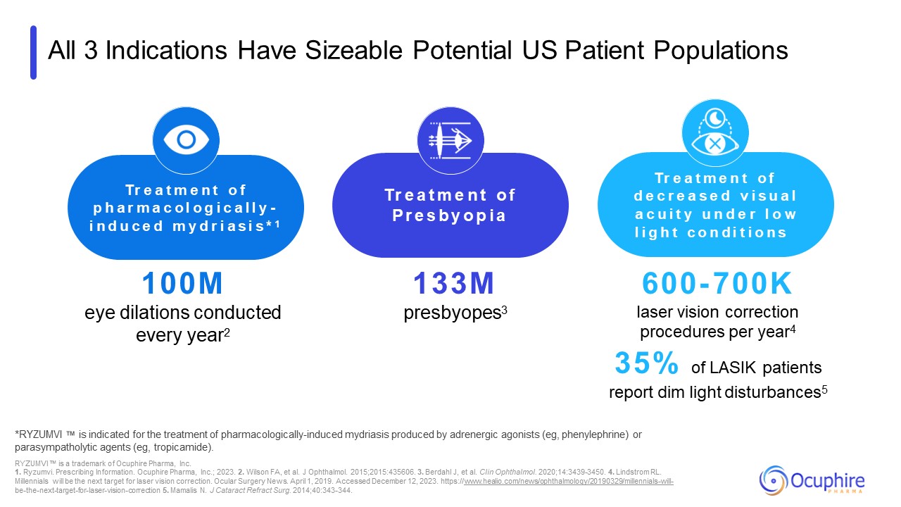 All 3 Indications Have Sizeable Potential US Patient Populations  *RYZUMVI is indicated for the treatment of pharmacologically-induced mydriasis produced by adrenergic agonists (eg, phenylephrine) or parasympatholytic agents (eg, tropicamide).  RYZUMVI is a trademark of Ocuphire Pharma, Inc.  1. Ryzumvi. Prescribing Information. Ocuphire Pharma, Inc.; 2023. 2. Wilson FA, et al. J Ophthalmol. 2015;2015:435606. 3. Berdahl J, et al. Clin Ophthalmol. 2020;14:3439-3450. 4. Lindstrom RL. Millennials will be the next target for laser vision correction. Ocular Surgery News. April 1, 2019. Accessed December 12, 2023. https://www.healio.com/news/ophthalmology/20190329/millennials-will- be-the-next-target-for-laser-vision-correction 5. Mamalis N. J Cataract Refract Surg. 2014;40:343-344.  100M   eye dilations conducted  every year2  Tr e a t m e n t o f  p h a r m a c o l o g i c a l l y - i n d u c e d m y d r i a s i s * 1  Tr e a t m e n t o f P r e s b y o p i a  Tr e a t m e n t o f  d e c r e a s e d v i s u a l a c u i t y u n d e r l o w l i g h t c o n d i t i o n s  133M   presbyopes3  600- 700K   laser vision correction  procedures per year4  35% of LASIK patients report dim light disturbances5