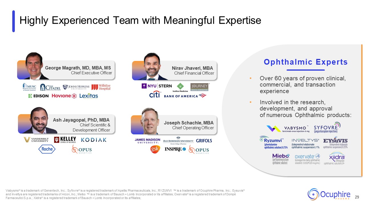Highly Experienced Team with Meaningful Expertise  Over 60 years of proven clinical, commercial, and transaction experience  Involved in the research, development, and approval  of numerous Ophthalmic products:  Ophthalmic Experts  29  Ash Jayagopal, PhD, MBA  Chief Scientific &  Development Officer  Vabysmo® is a trademark of Genentech, Inc.; Syfovre® is a registered trademark of Apellis Pharmaceuticals, Inc.; RYZUMVI is a trademark of Ocuphire Pharma, Inc.; Eysuvis® and Inveltys are registered trademarks of Alcon, Inc.; Meibo is a trademark of Bausch + Lomb Incorporated or its affiliates; Oxervate® is a registered trademark of Dompé Farmaceutici S.p.a.; Xiidra® is a registered trademark of Bausch + Lomb Incorporated or its affiliates;  George Magrath, MD, MBA, MS  Chief Executive Officer  Nirav Jhaveri, MBA  Chief Financial Officer  Joseph Schachle, MBA  Chief Operating Officer