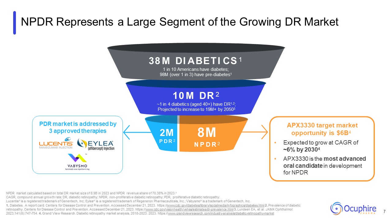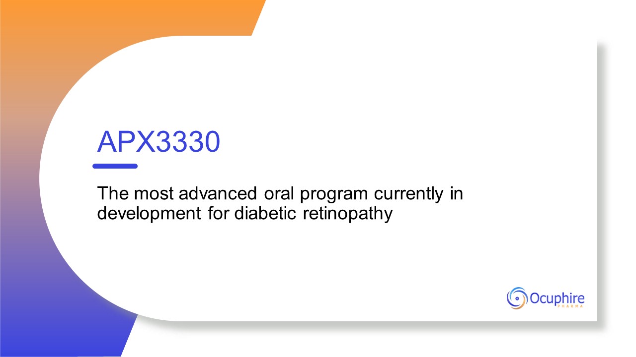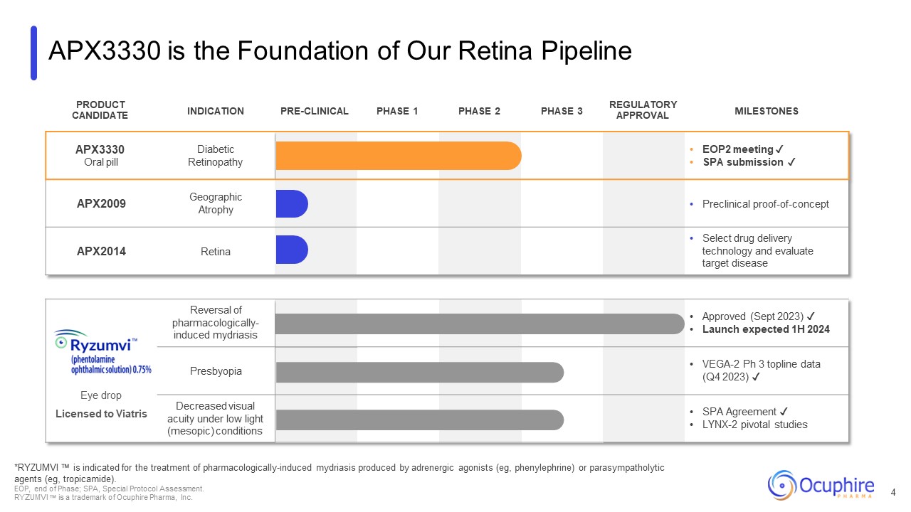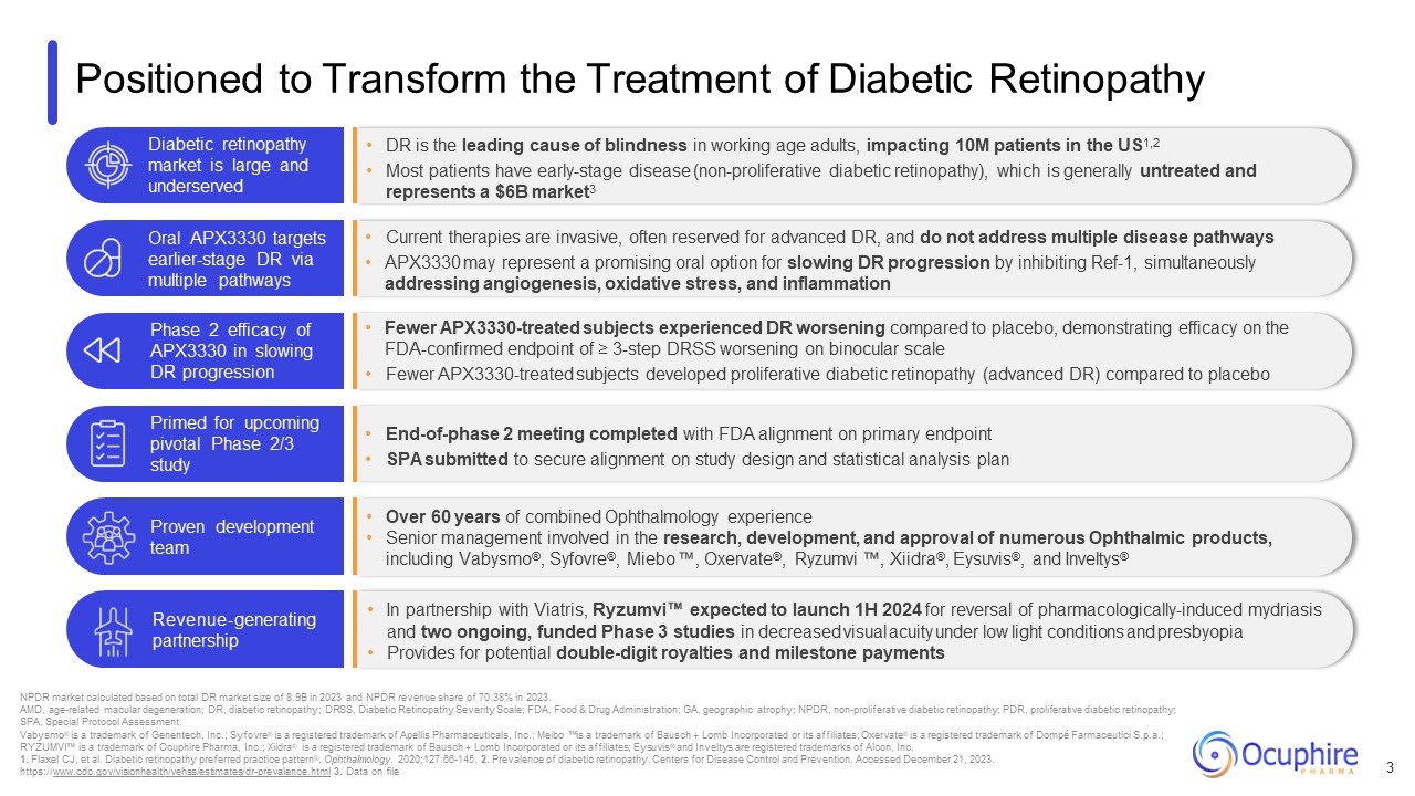 Positioned to Transform the Treatment of Diabetic Retinopathy  3  NPDR market calculated based on total DR market size of 8.9B in 2023 and NPDR revenue share of 70.38% in 2023.  AMD, age-related macular degeneration; DR, diabetic retinopathy; DRSS, Diabetic Retinopathy Severity Scale; FDA, Food & Drug Administration; GA, geographic atrophy; NPDR, non-proliferative diabetic retinopathy; PDR, proliferative diabetic retinopathy; SPA, Special Protocol Assessment.  Vabysmo® is a trademark of Genentech, Inc.; Syfovre® is a registered trademark of Apellis Pharmaceuticals, Inc.; Meibo is a trademark of Bausch + Lomb Incorporated or its affiliates; Oxervate® is a registered trademark of Dompé Farmaceutici S.p.a.; RYZUMVI is a trademark of Ocuphire Pharma, Inc.; Xiidra® is a registered trademark of Bausch + Lomb Incorporated or its affiliates; Eysuvis® and Inveltys are registered trademarks of Alcon, Inc.  1. Flaxel CJ, et al. Diabetic retinopathy preferred practice pattern®. Ophthalmology. 2020;127:66-145. 2. Prevalence of diabetic retinopathy. Centers for Disease Control and Prevention. Accessed December 21, 2023. https://www.cdc.gov/visionhealth/vehss/estimates/dr-prevalence.html 3. Data on file  DR is the leading cause of blindness in working age adults, impacting 10M patients in the US1,2  Most patients have early-stage disease (non-proliferative diabetic retinopathy), which is generally untreated and represents a $6B market3  Diabetic retinopathy market is large and underserved  Current therapies are invasive, often reserved for advanced DR, and do not address multiple disease pathways  APX3330 may represent a promising oral option for slowing DR progression by inhibiting Ref-1, simultaneously  addressing angiogenesis, oxidative stress, and inflammation  Oral APX3330 targets earlier-stage DR via multiple pathways  Fewer APX3330-treated subjects experienced DR worsening compared to placebo, demonstrating efficacy on the  FDA-confirmed endpoint of ≥ 3-step DRSS worsening on binocular scale  Fewer APX3330-treated subjects developed proliferative diabetic retinopathy (advanced DR) compared to placebo  Phase 2 efficacy of APX3330 in slowing DR progression  End-of-phase 2 meeting completed with FDA alignment on primary endpoint  SPA submitted to secure alignment on study design and statistical analysis plan  Primed for upcoming pivotal Phase 2/3 study  Over 60 years of combined Ophthalmology experience  Senior management involved in the research, development, and approval of numerous Ophthalmic products,  including Vabysmo®, Syfovre®, Miebo , Oxervate®, Ryzumvi , Xiidra®, Eysuvis®, and Inveltys®  In partnership with Viatris, Ryzumvi expected to launch 1H 2024 for reversal of pharmacologically-induced mydriasis and two ongoing, funded Phase 3 studies in decreased visual acuity under low light conditions and presbyopia  Provides for potential double-digit royalties and milestone payments  Proven development team  Revenue-generating  partnership