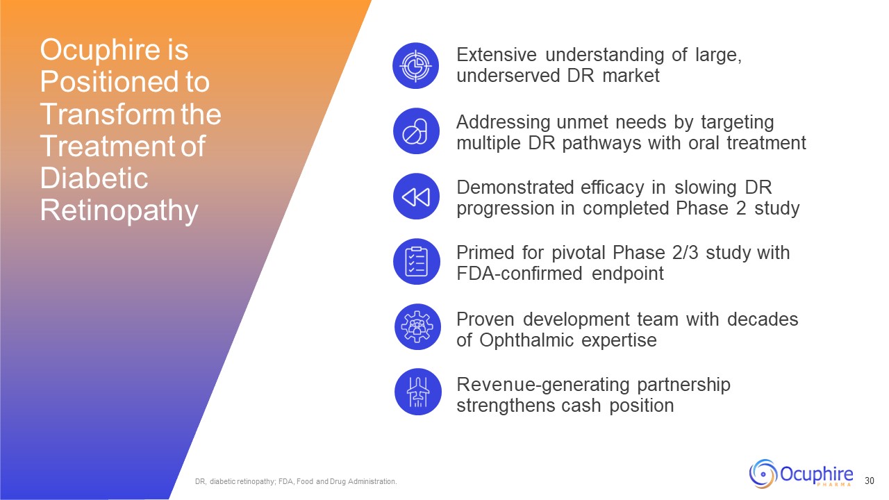 DR, diabetic retinopathy; FDA, Food and Drug Administration.  Ocuphire is Positioned to Transform the Treatment of Diabetic Retinopathy  Extensive understanding of large, underserved DR market  Addressing unmet needs by targeting multiple DR pathways with oral treatment  Demonstrated efficacy in slowing DR progression in completed Phase 2 study  Primed for pivotal Phase 2/3 study with FDA-confirmed endpoint  Proven development team with decades of Ophthalmic expertise  Revenue-generating partnership  strengthens cash position  30