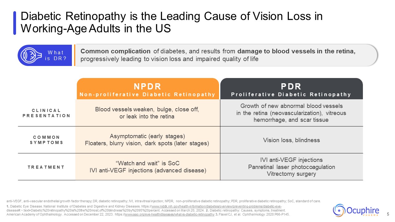 APX3330 is the Foundation of Our Retina Pipeline  PRODUCT CANDIDATE  INDICATION  PRE-CLINICAL  PHASE 1  PHASE 2  PHASE 3  REGULATORY APPROVAL  MILESTONES  APX3330  Oral pill  Diabetic Retinopathy  EOP2 meeting ✓  SPA submission ✓  APX2009  Geographic  Atrophy  Preclinical proof-of-concept  APX2014  Retina  Select drug delivery technology and evaluate target disease  Eye drop  Licensed to Viatris  Reversal of pharmacologically- induced mydriasis  Approved (Sept 2023) ✓  Launch expected 1H 2024  Presbyopia  VEGA-2 Ph 3 topline data (Q4 2023) ✓  Decreased visual acuity under low light (mesopic) conditions  SPA Agreement ✓  LYNX-2 pivotal studies  *RYZUMVI is indicated for the treatment of pharmacologically-induced mydriasis produced by adrenergic agonists (eg, phenylephrine) or parasympatholytic  agents (eg, tropicamide).  EOP, end of Phase; SPA, Special Protocol Assessment. RYZUMVI is a trademark of Ocuphire Pharma, Inc.  4