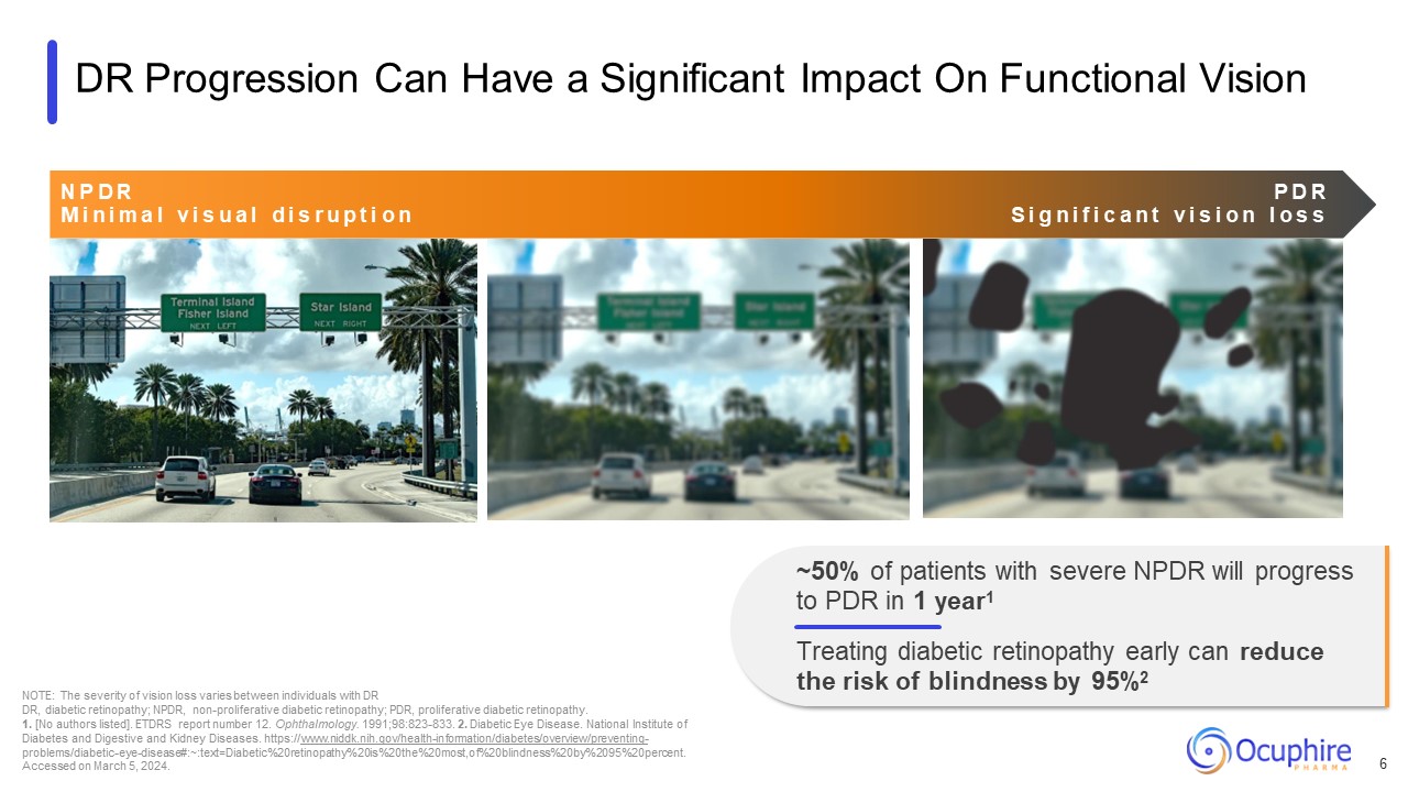 DR Progression Can Have a Significant Impact On Functional Vision  NOTE: The severity of vision loss varies between individuals with DR  DR, diabetic retinopathy; NPDR, non-proliferative diabetic retinopathy; PDR, proliferative diabetic retinopathy.  1. [No authors listed]. ETDRS report number 12. Ophthalmology. 1991;98:823-833. 2. Diabetic Eye Disease. National Institute of Diabetes and Digestive and Kidney Diseases. https://www.niddk.nih.gov/health-information/diabetes/overview/preventing- problems/diabetic-eye-disease#:~:text=Diabetic%20retinopathy%20is%20the%20most,of%20blindness%20by%2095%20percent. Accessed on March 5, 2024.  N P D R  P D R  M i n i m a l  v i s u a l  d i s r u p t i o n  S i g n i f i c a n t  v i s i o n  l o s s  ~50% of patients with severe NPDR will progress  to PDR in 1 year1  Treating diabetic retinopathy early can reduce the risk of blindness by 95%2  6